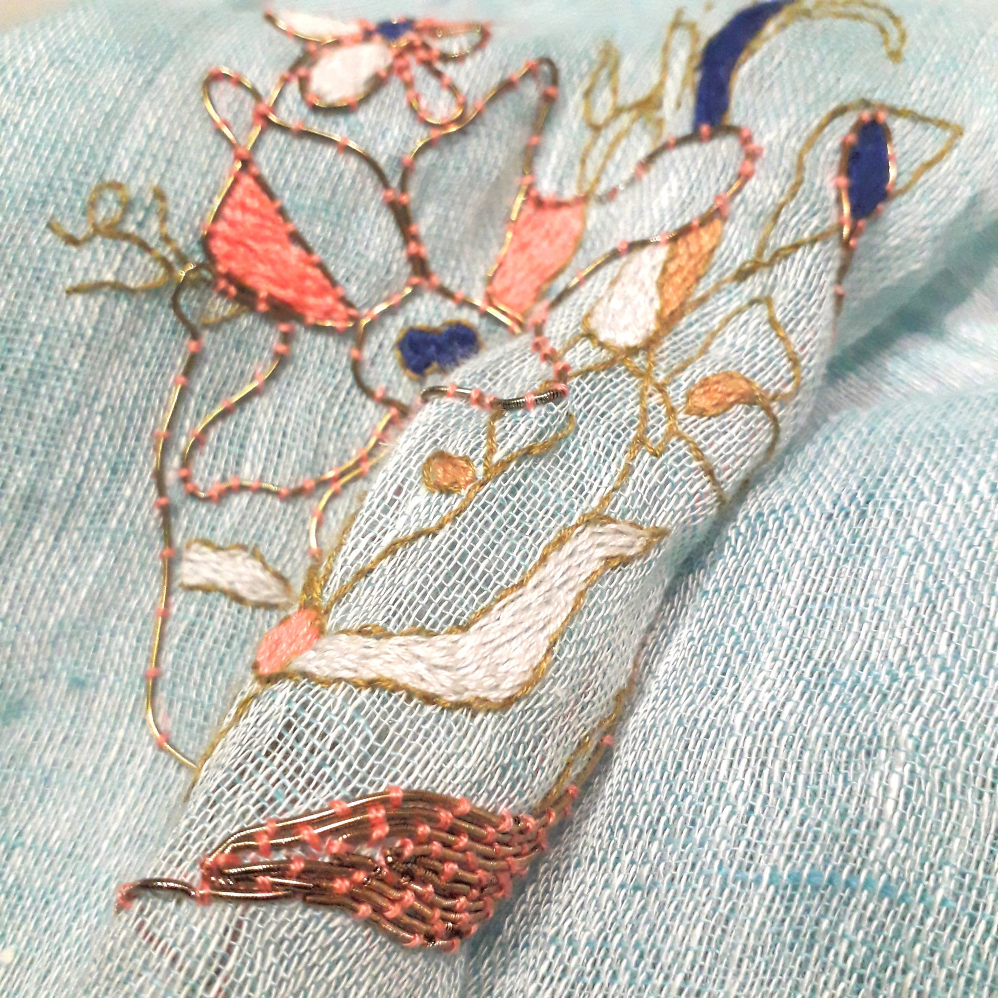 Hand embroidery is used to create a modern and abstract artistic pattern on 2 tone pure linen scarf. It is worked stitch by stitch by using color thread and Indian metallic thread to form an artistic abstract pattern, Lady in flowers. It is absolutely an wearable art piece.
