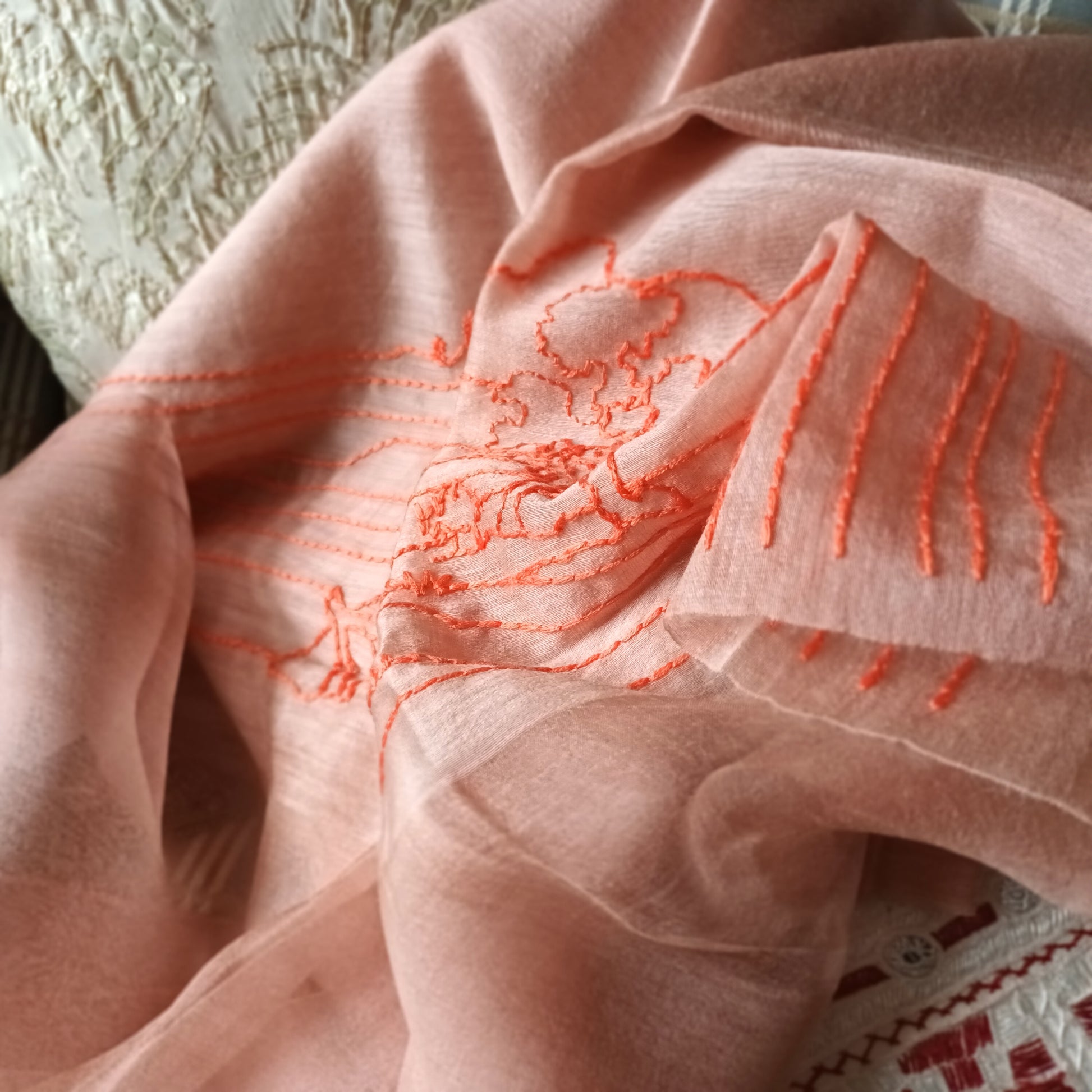 這四季皆宜的刺繡薄紗圍巾 50%真絲50%羊毛 比純絲的圍巾保暖, 比全羊毛圍巾輕巧, 容易收藏携帶. 在初冬微冷或出差面對冷熱不定的環境最適合. 輕巧而保暖 , 是集時尚和實務於一身的漂亮設計.