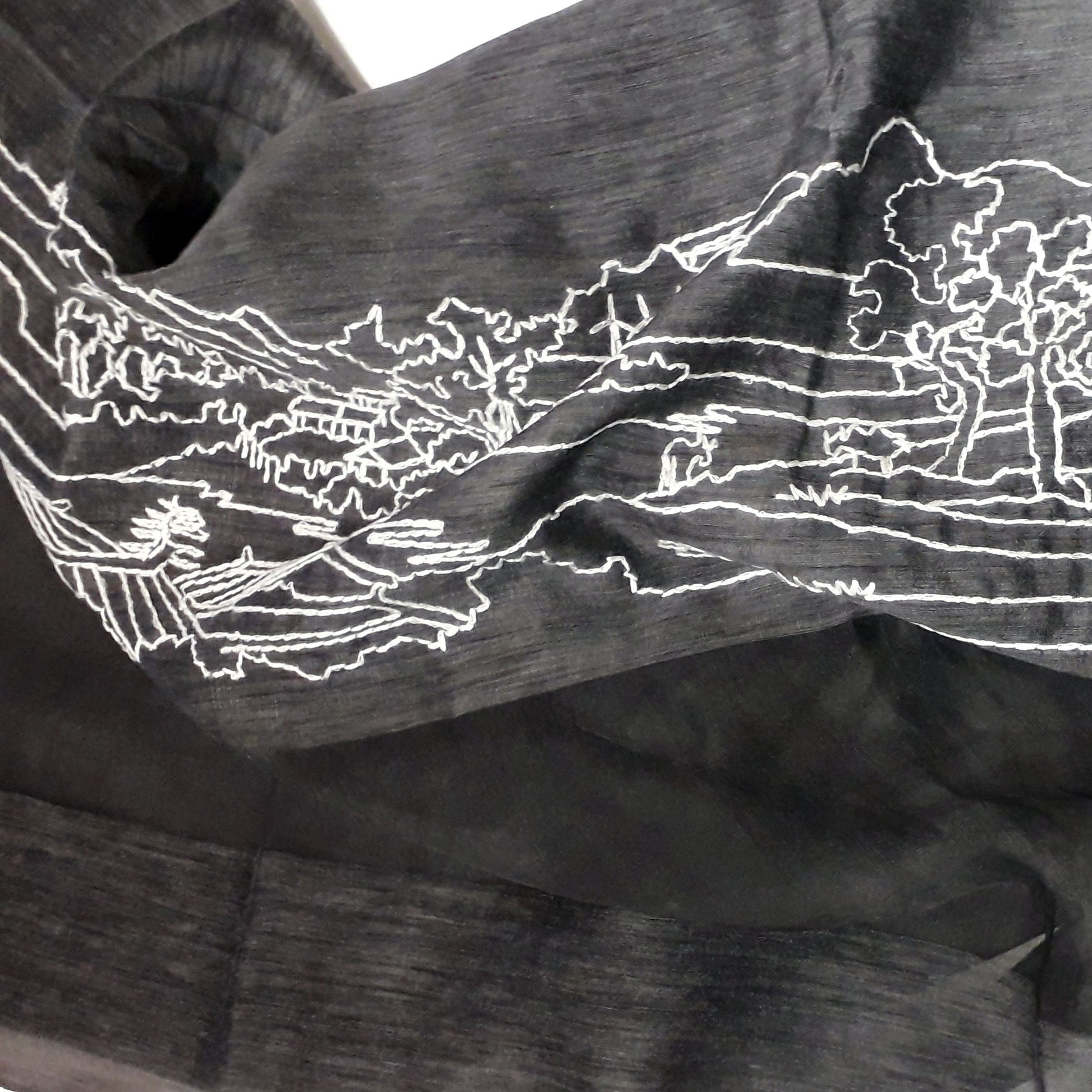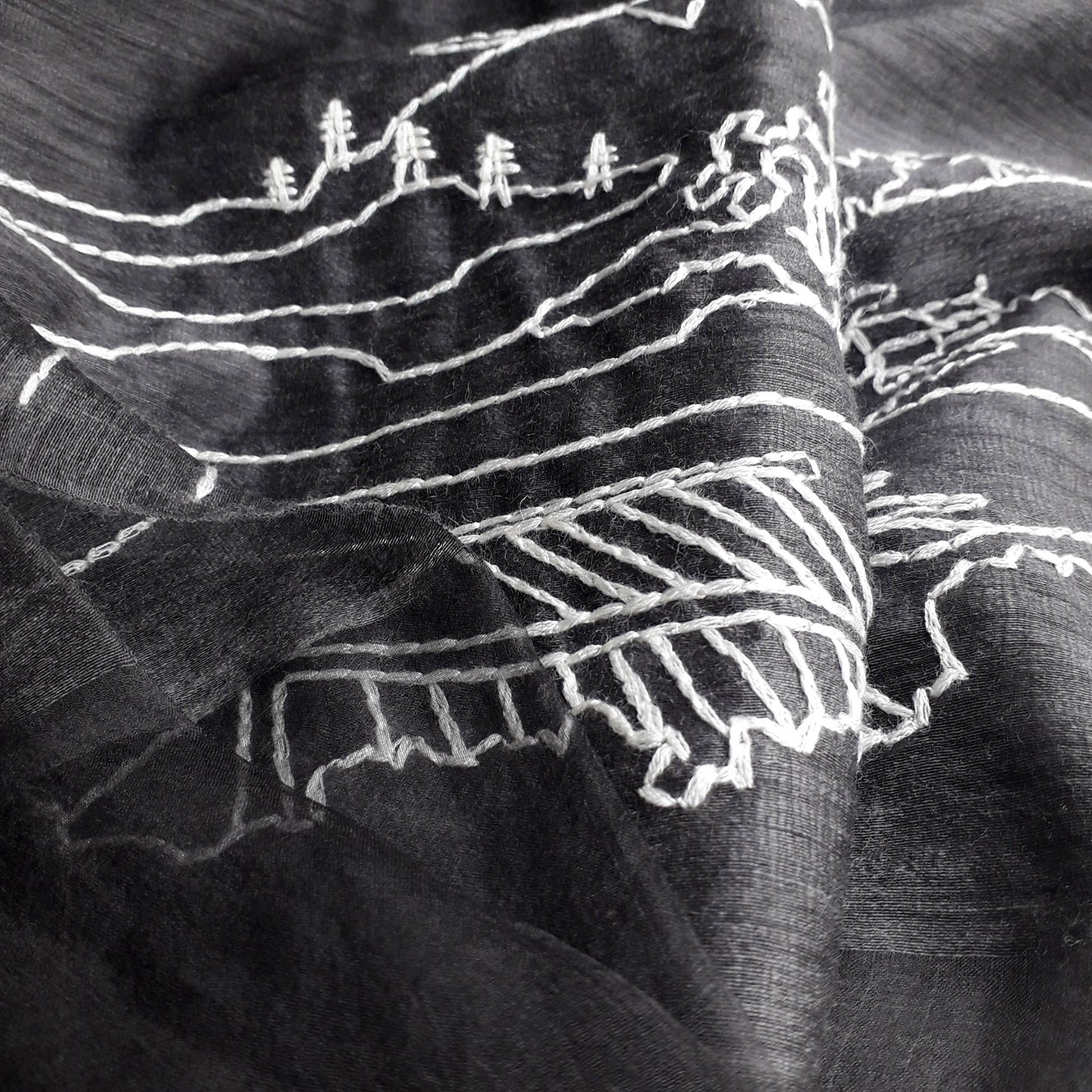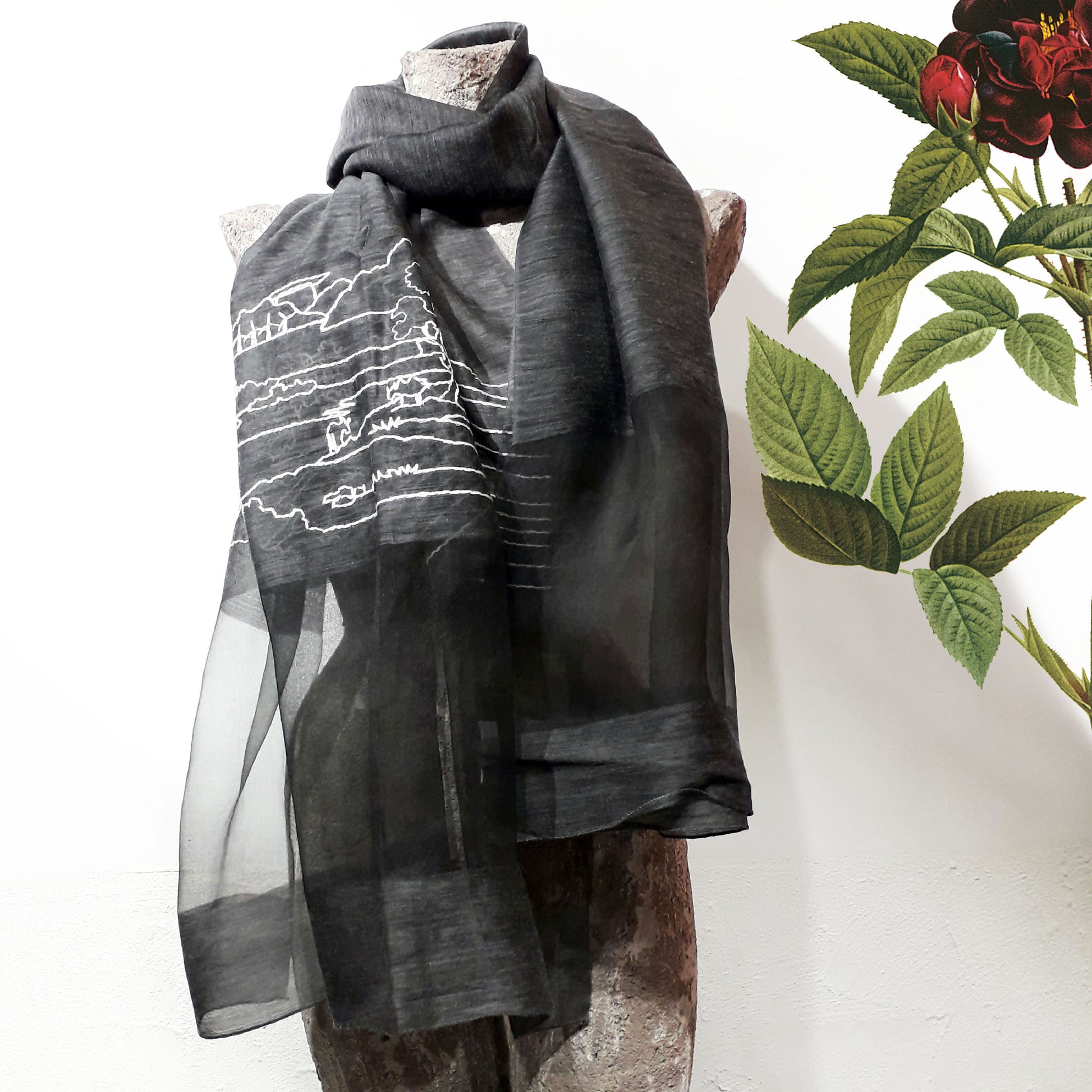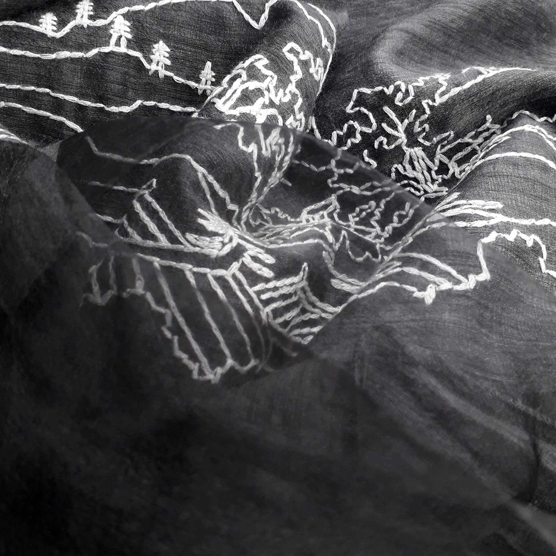 All seasons silk wool embroidery sheer scarf in moon village line art