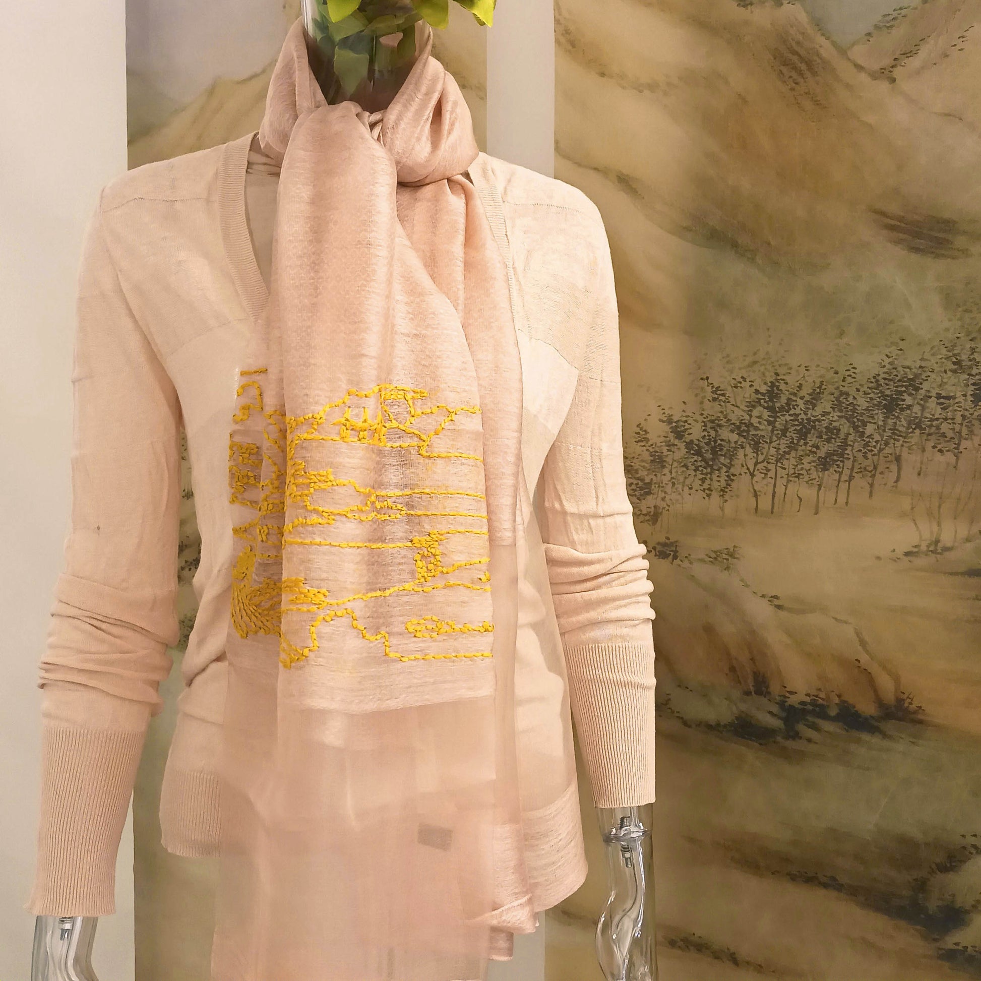 It is a light weight sheer fabric made of 50%silk 50%wool featured by an embroidery of our imagined moon village line art pattern delineate an old village equipped by technology. This scarf is sheer and warm keeping, perfect for travelling and air
