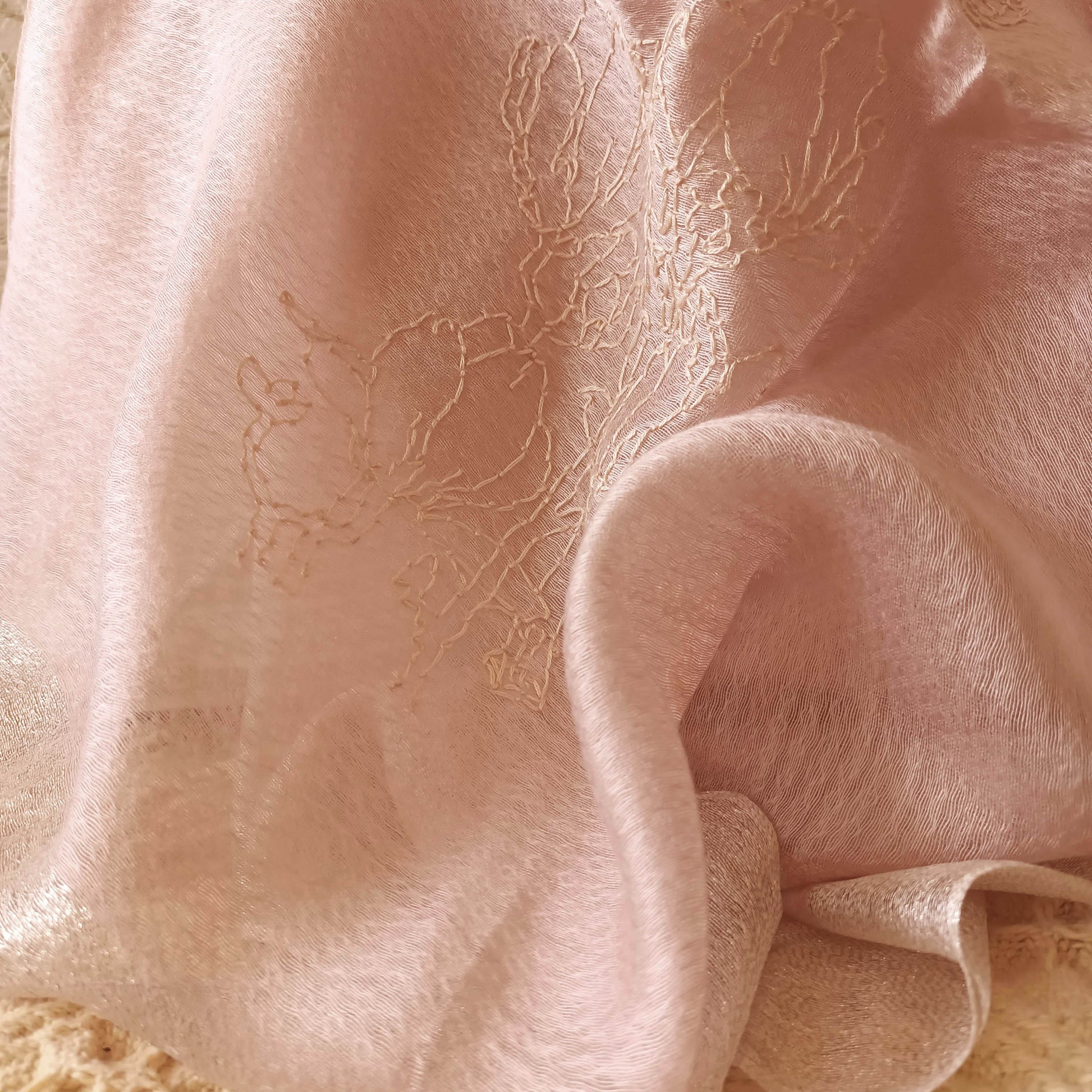 A hand embroidered Magnolia flower line art pattern sits on the shimmering surface of the scarf. An tiny elf is playing around the Magnolia, enjoying the nature and freedom of joy. This scarf delineates the beautiful gesture of plant, and tells the story of nature and elf.