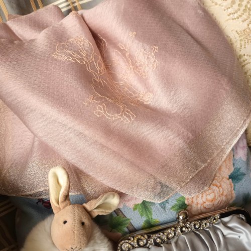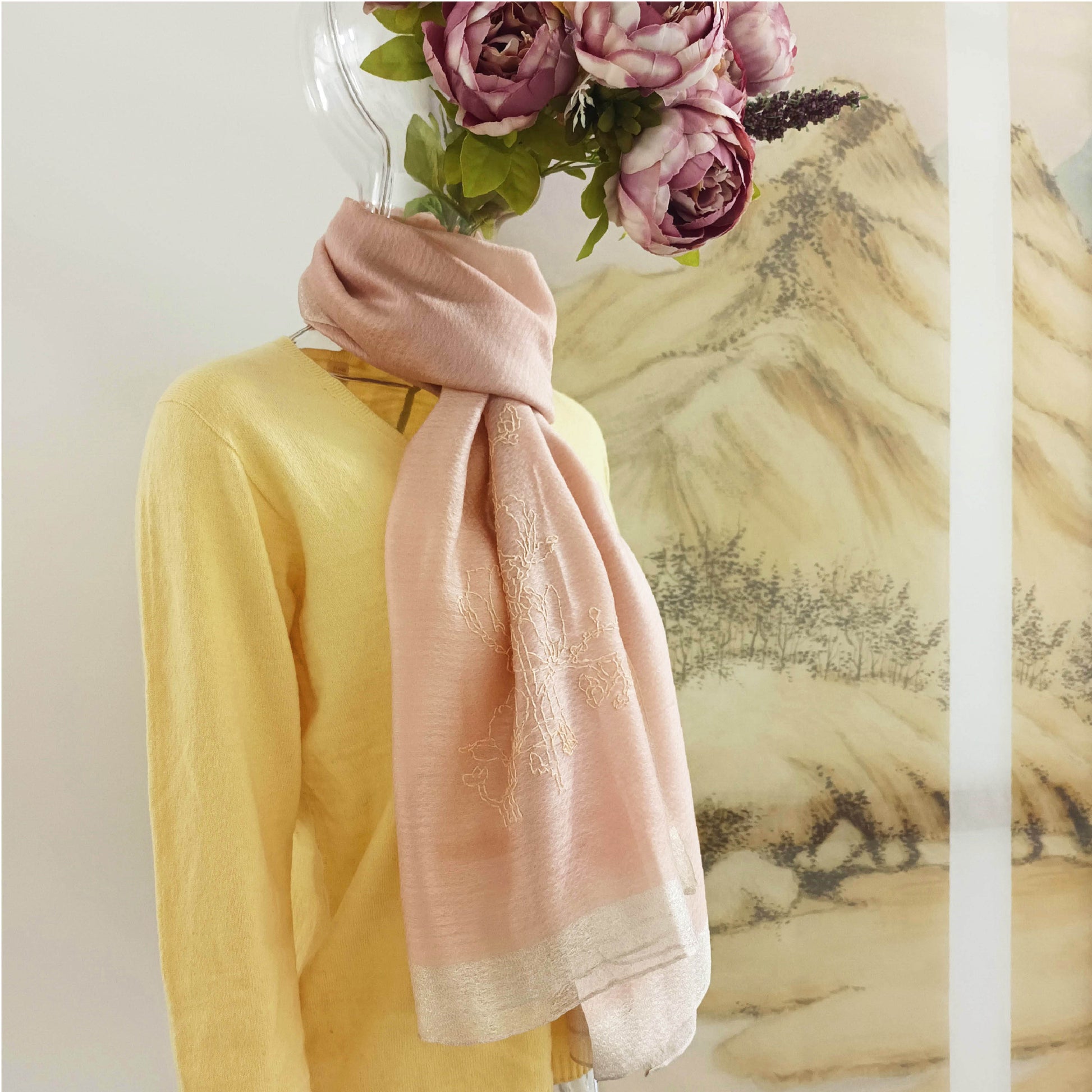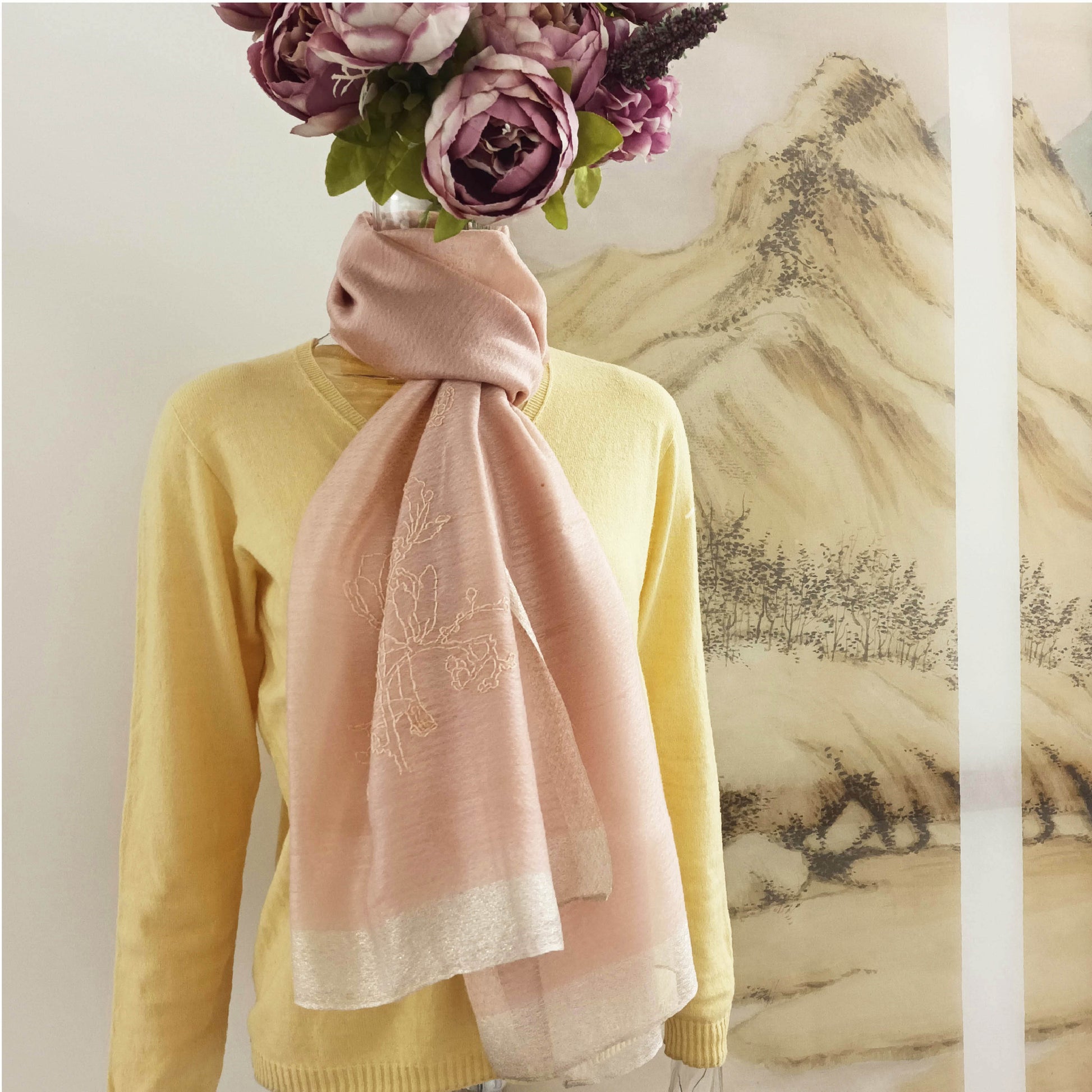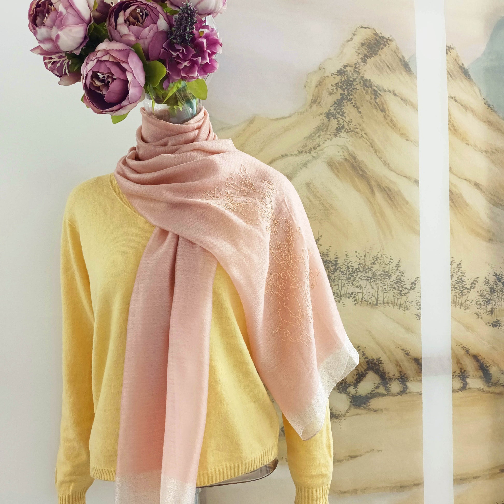 手工刺繡百搭真絲羊毛長圍巾 - 玉蘭花的遊樂場