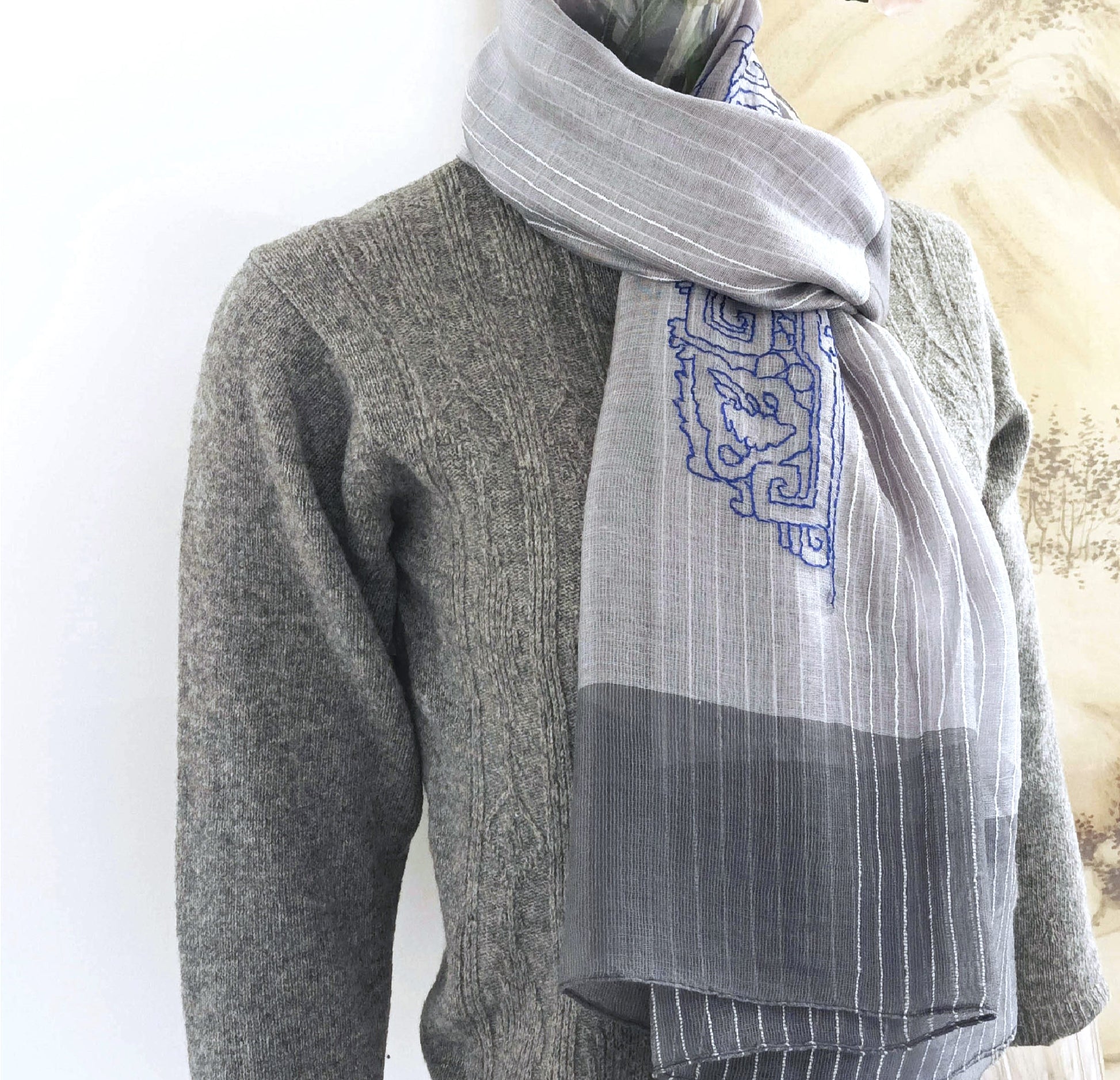 我們在這柔薄的黑白色糸圍巾, 以自由的針法手工刺綉了一個中國鬥拱線條圖案, 勾勒出中國建築的美麗結構。實用而獨特稀有.