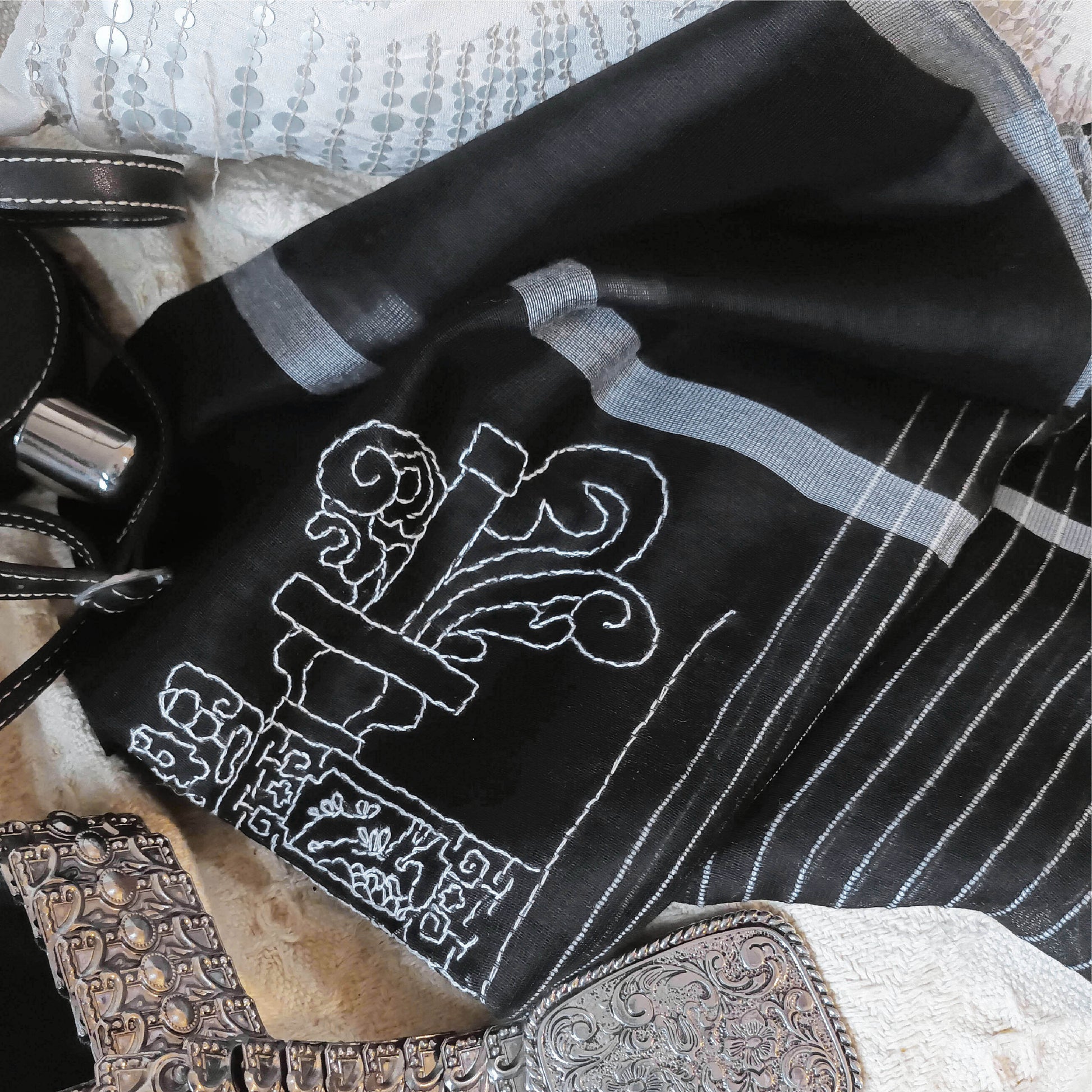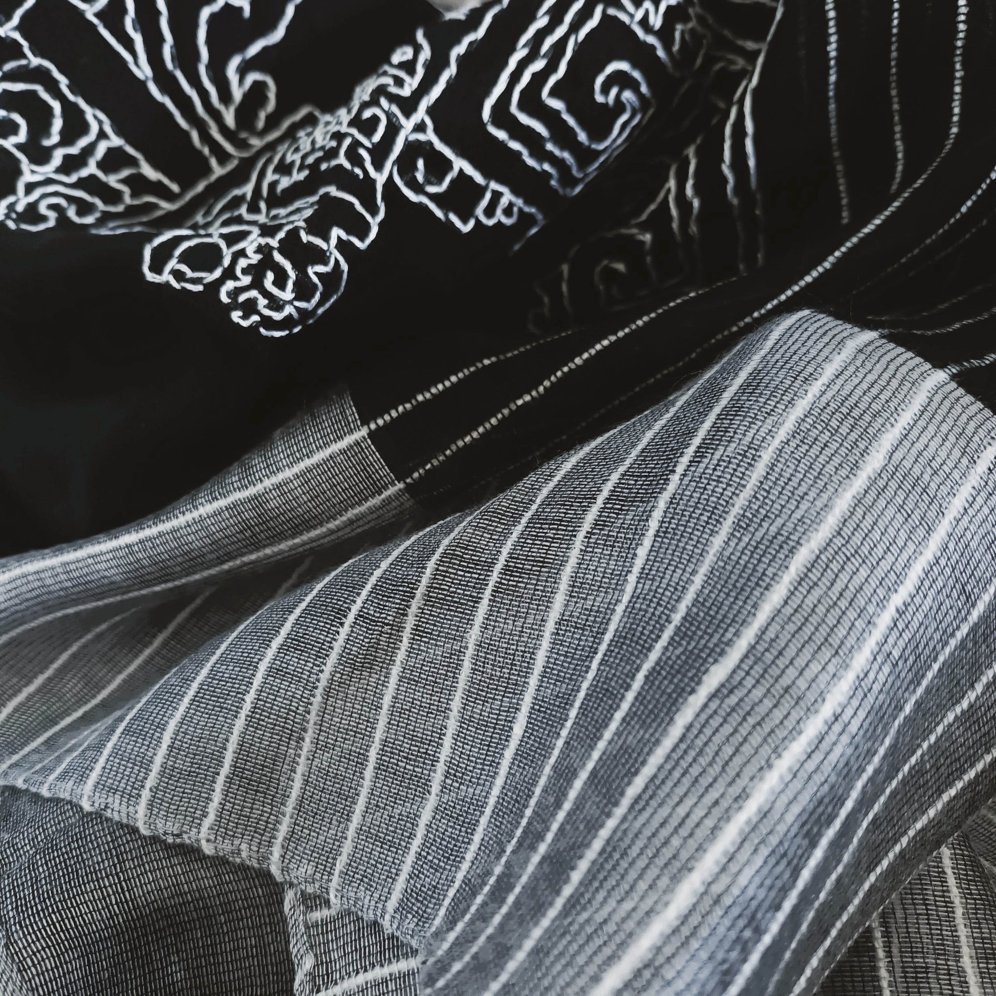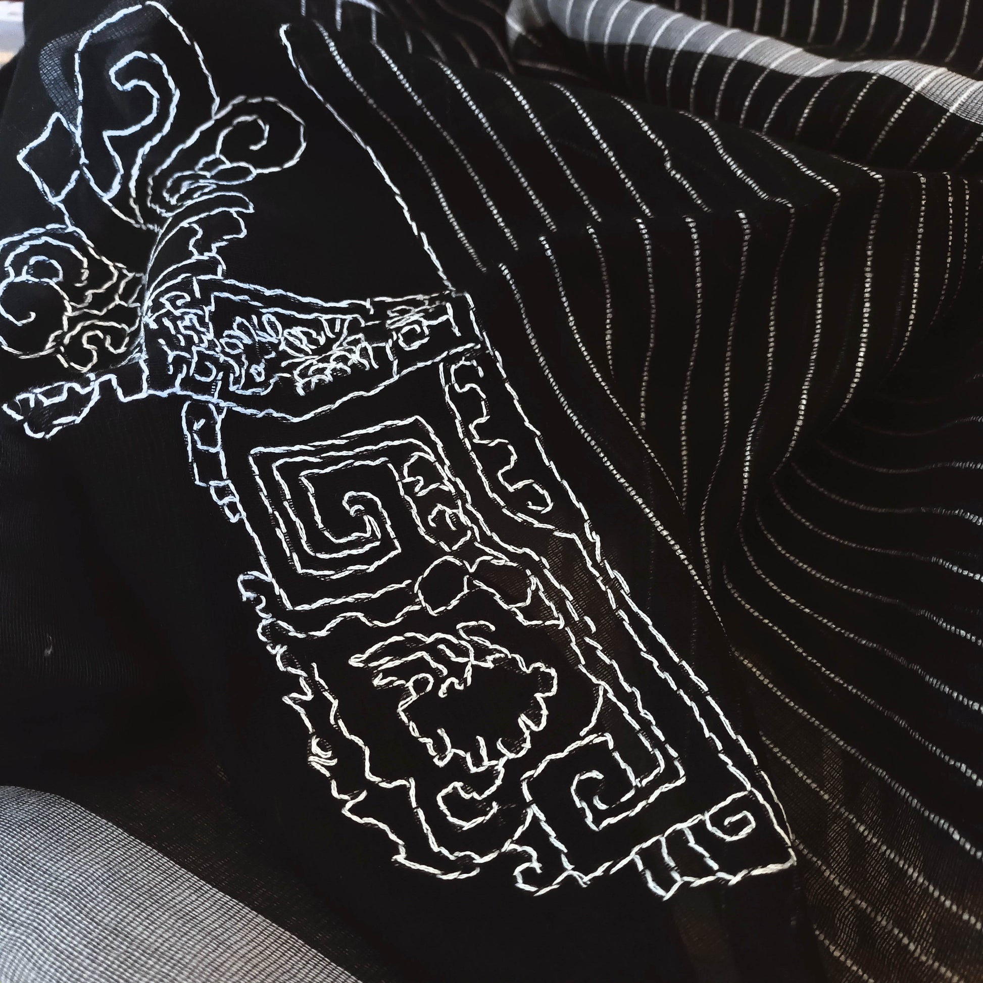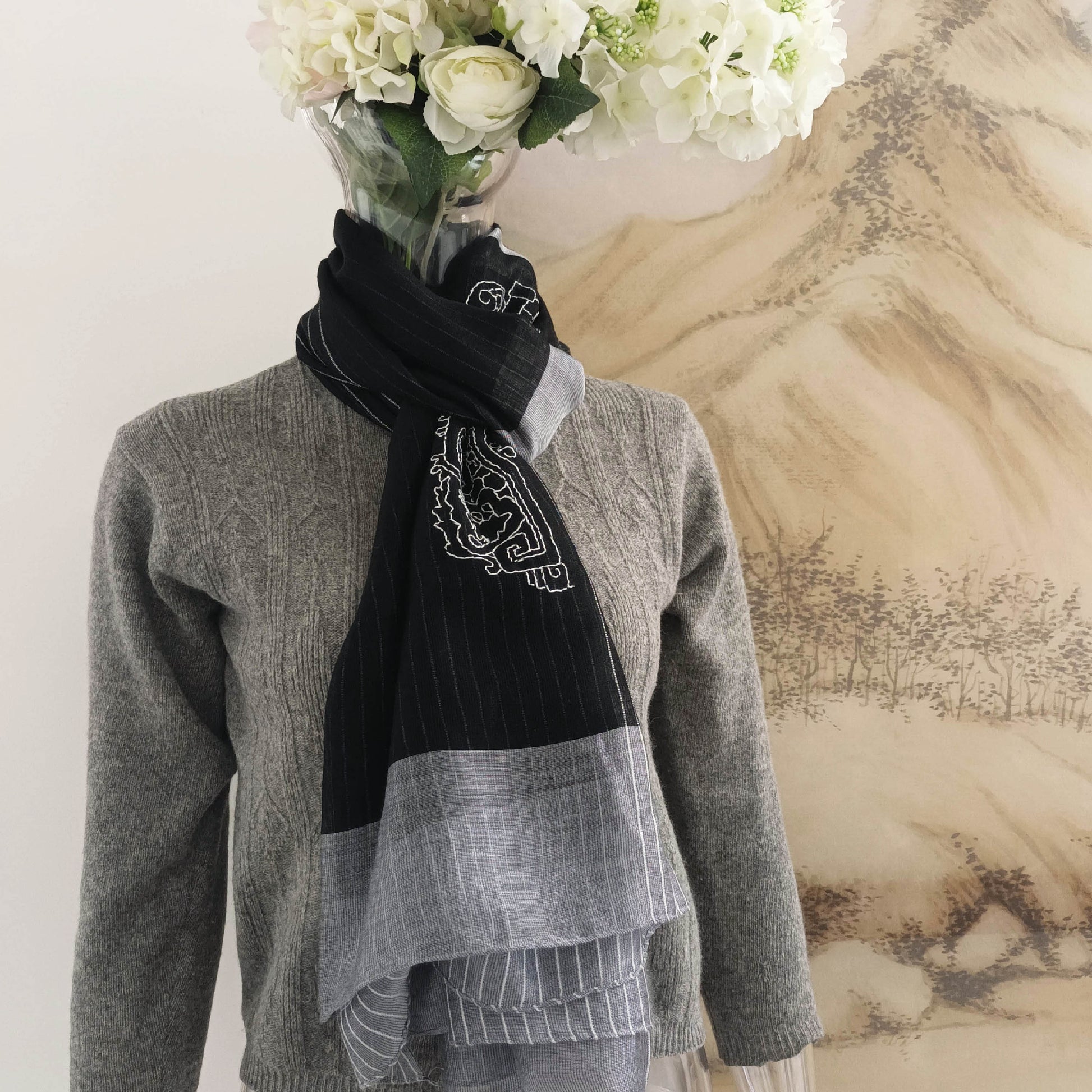 我們在這柔薄的黑白色糸圍巾, 以自由的針法手工刺綉了一個中國鬥拱線條圖案, 勾勒出中國建築的美麗結構。實用而獨特稀有.