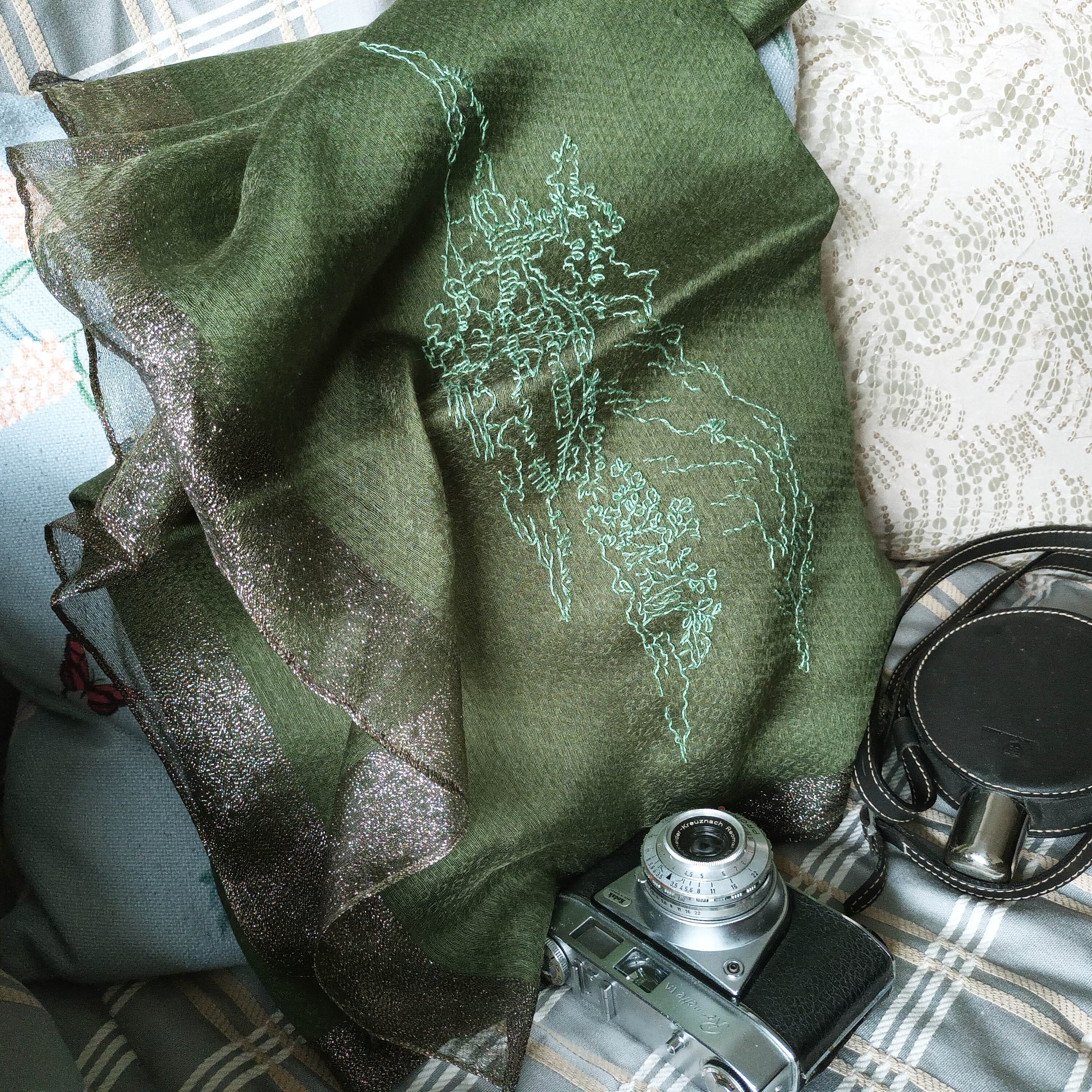 A hand embroidered landscape line art pattern sits on the shimmering surface of the scarf. A secret flying saucer is landed quietly behind the woods adjacent to small cottages. This scarf delineates the beautiful rural landscape, and tells the story of nature and technology.