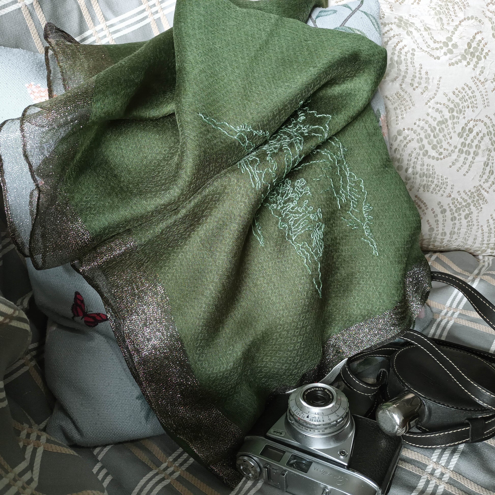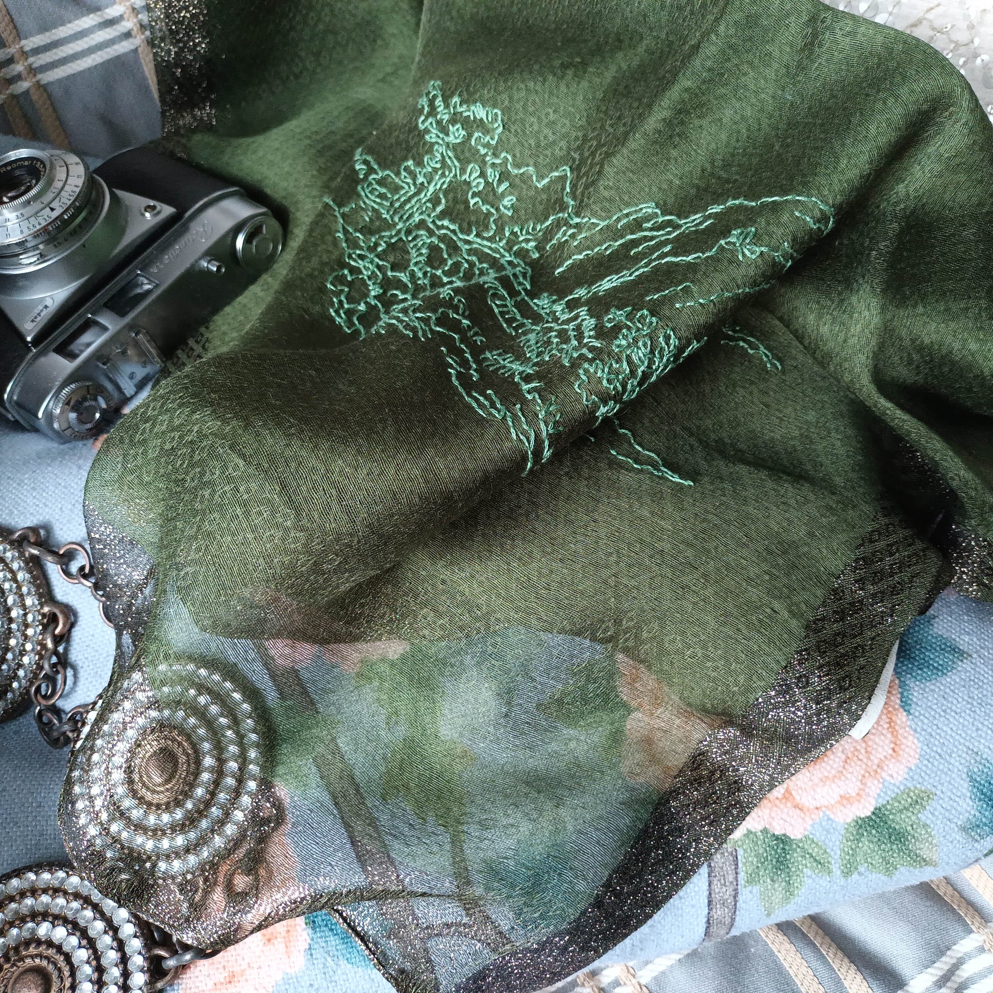 All seasons silk wool hand embroidery sheer scarf - flying saucer & landscape