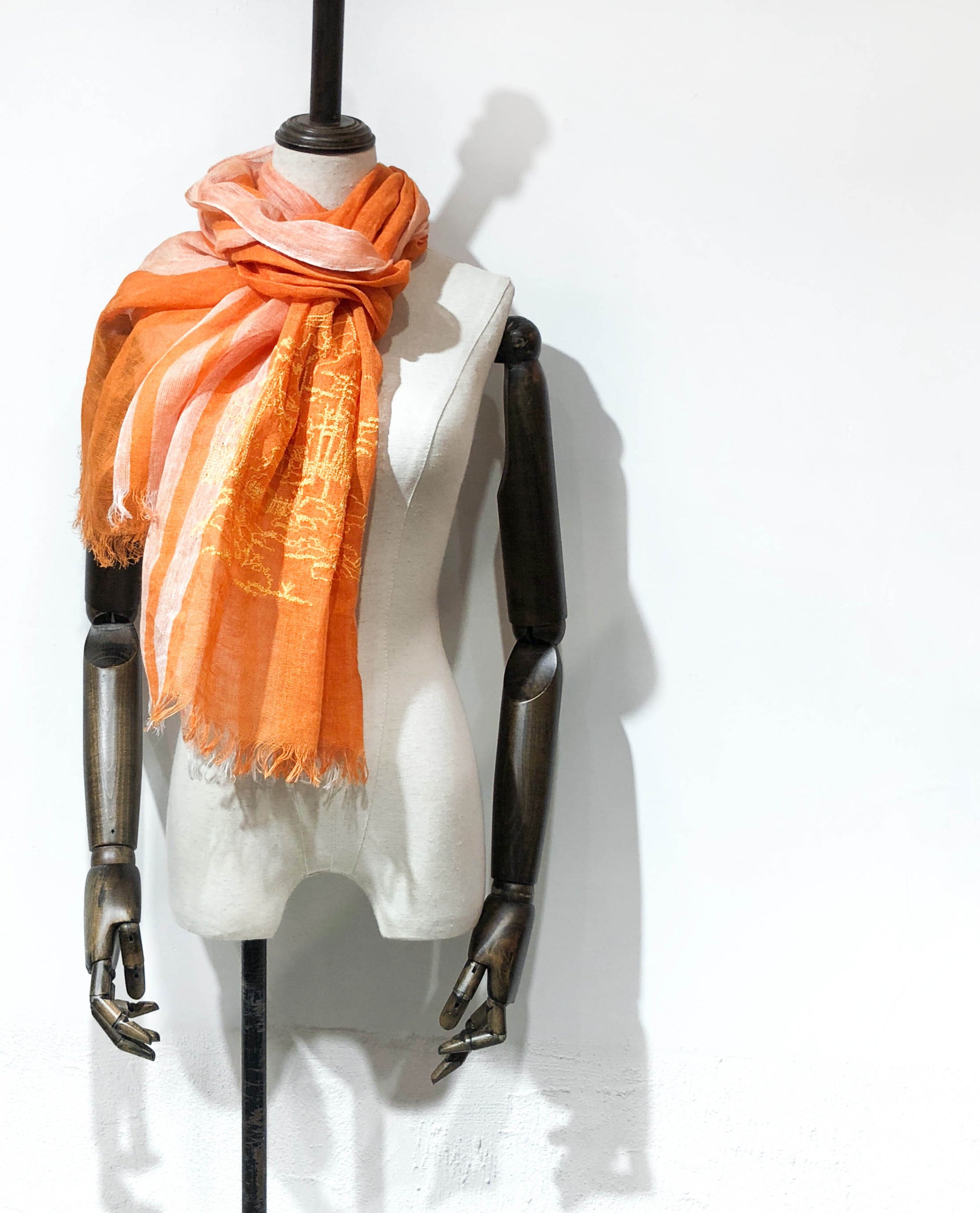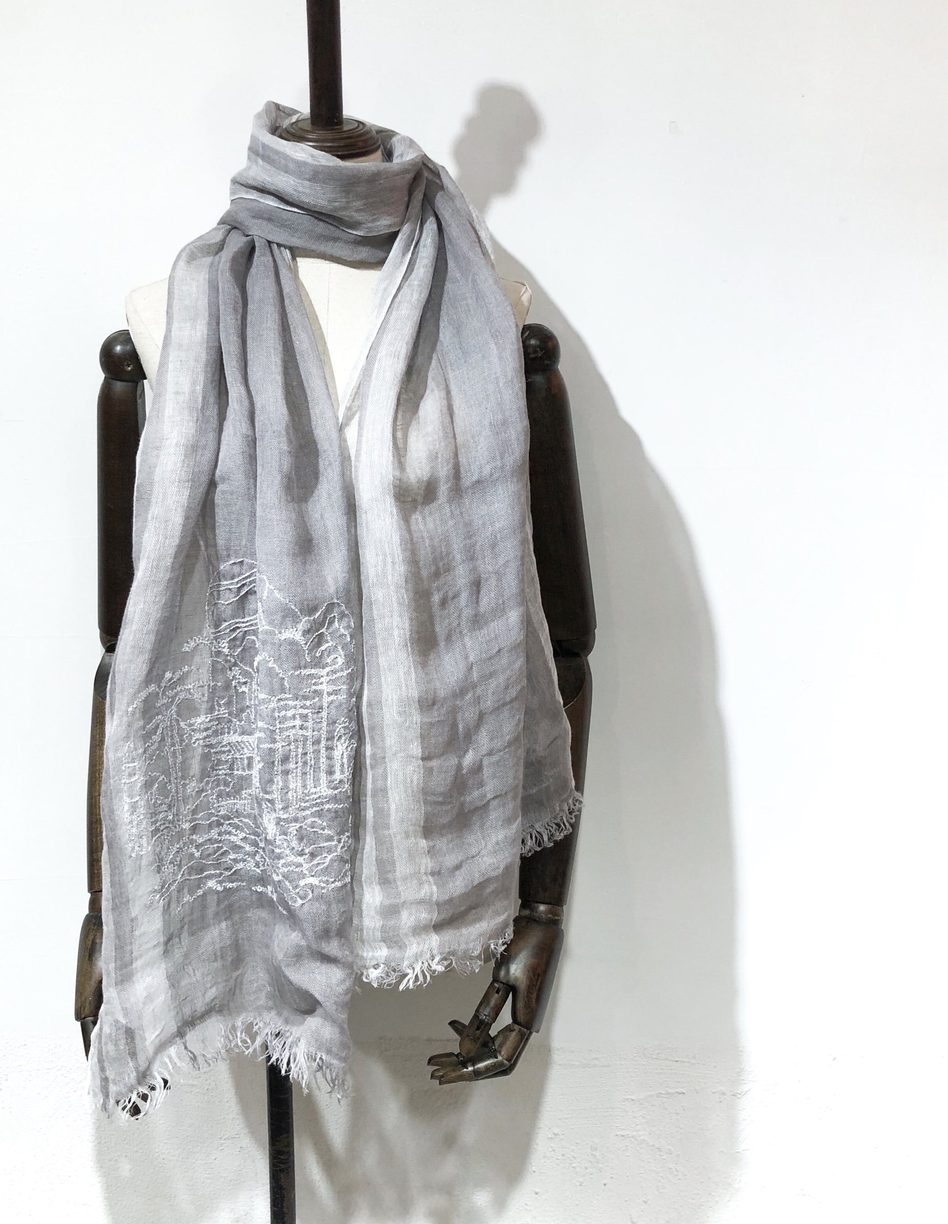On this linen scarf, it carries a line art picture about a spaceman gets lost in an old village equipped with high technology.