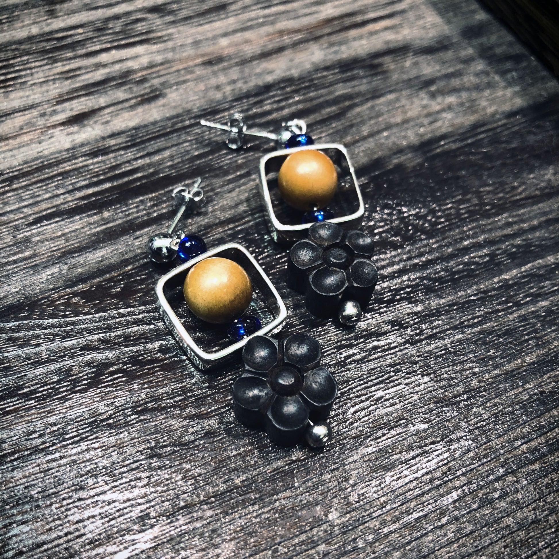 This earrings has a combination of square, floral shape and sphere presents an aesthetic of simple geometry, fashionable and stylish.