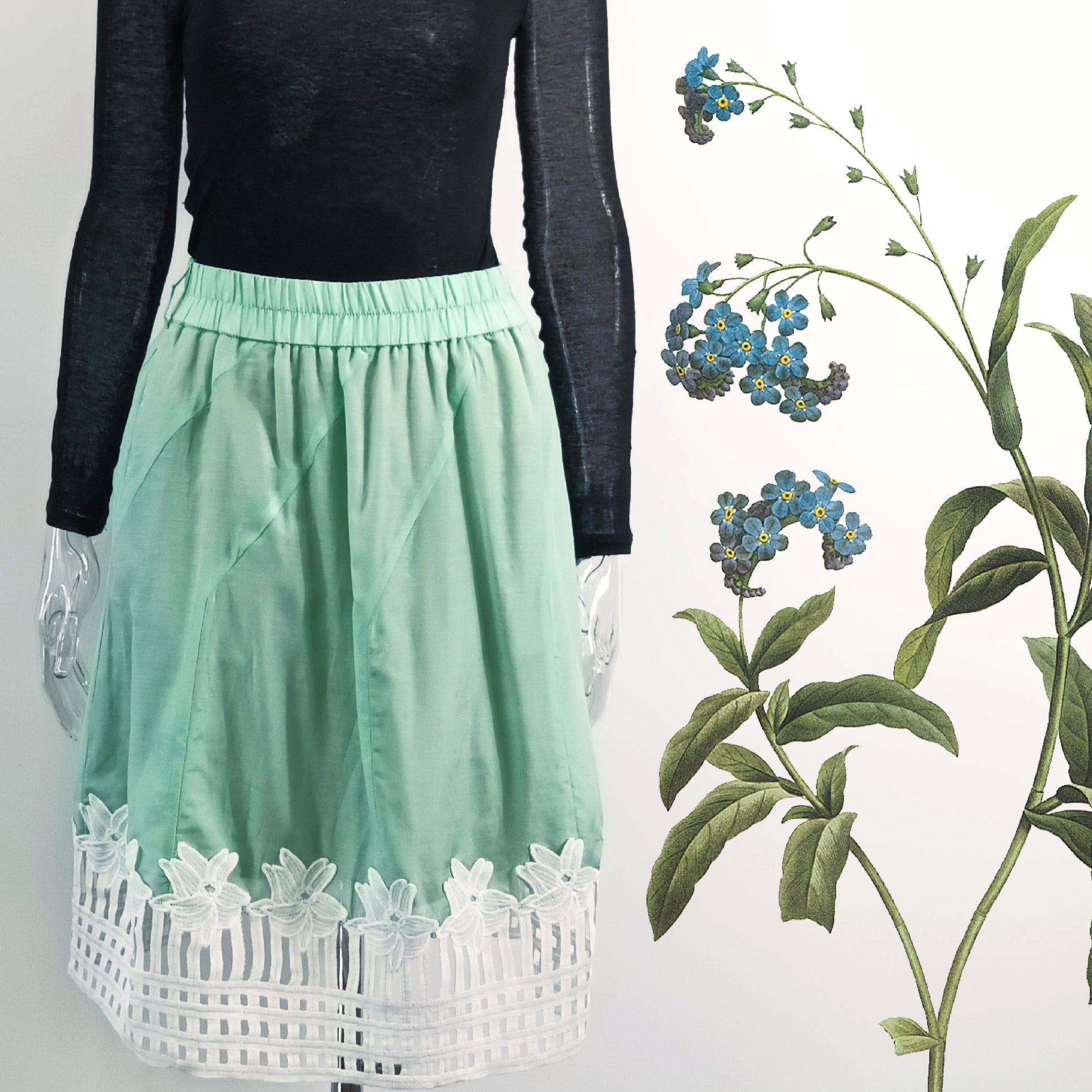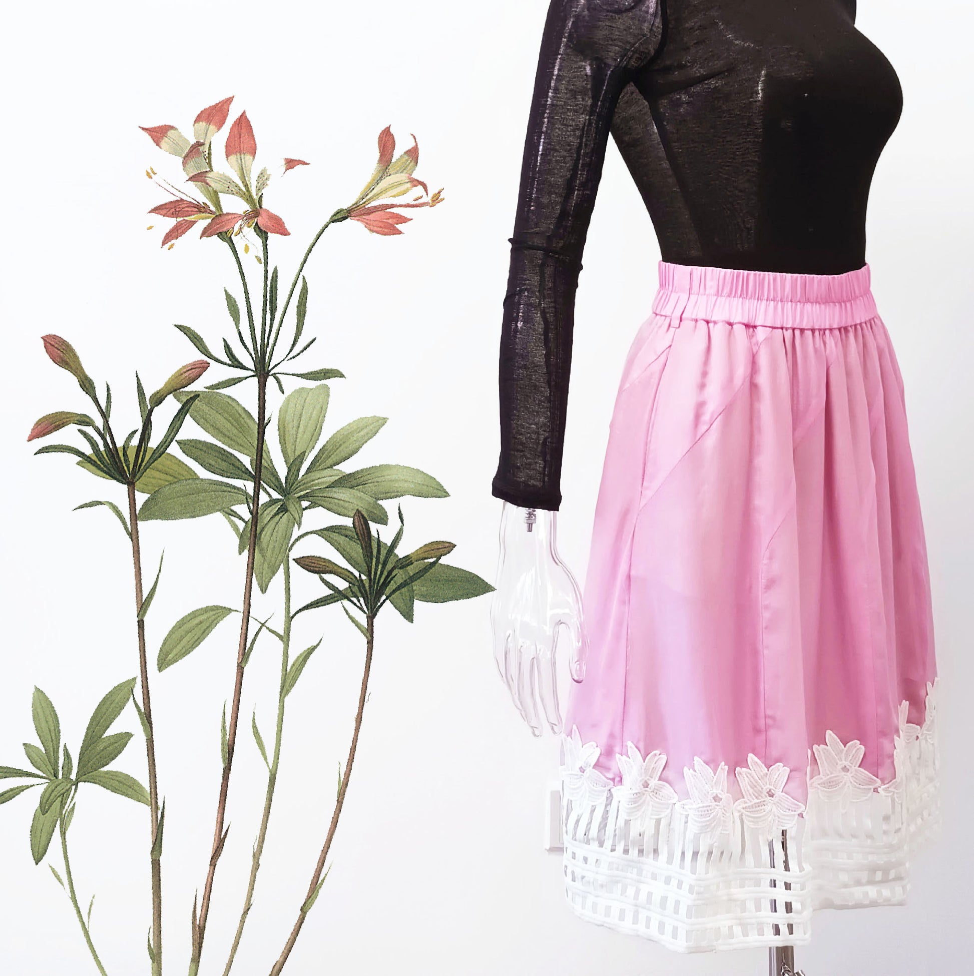 Candy color silk elastic waist lined skirt in bold white lace hem