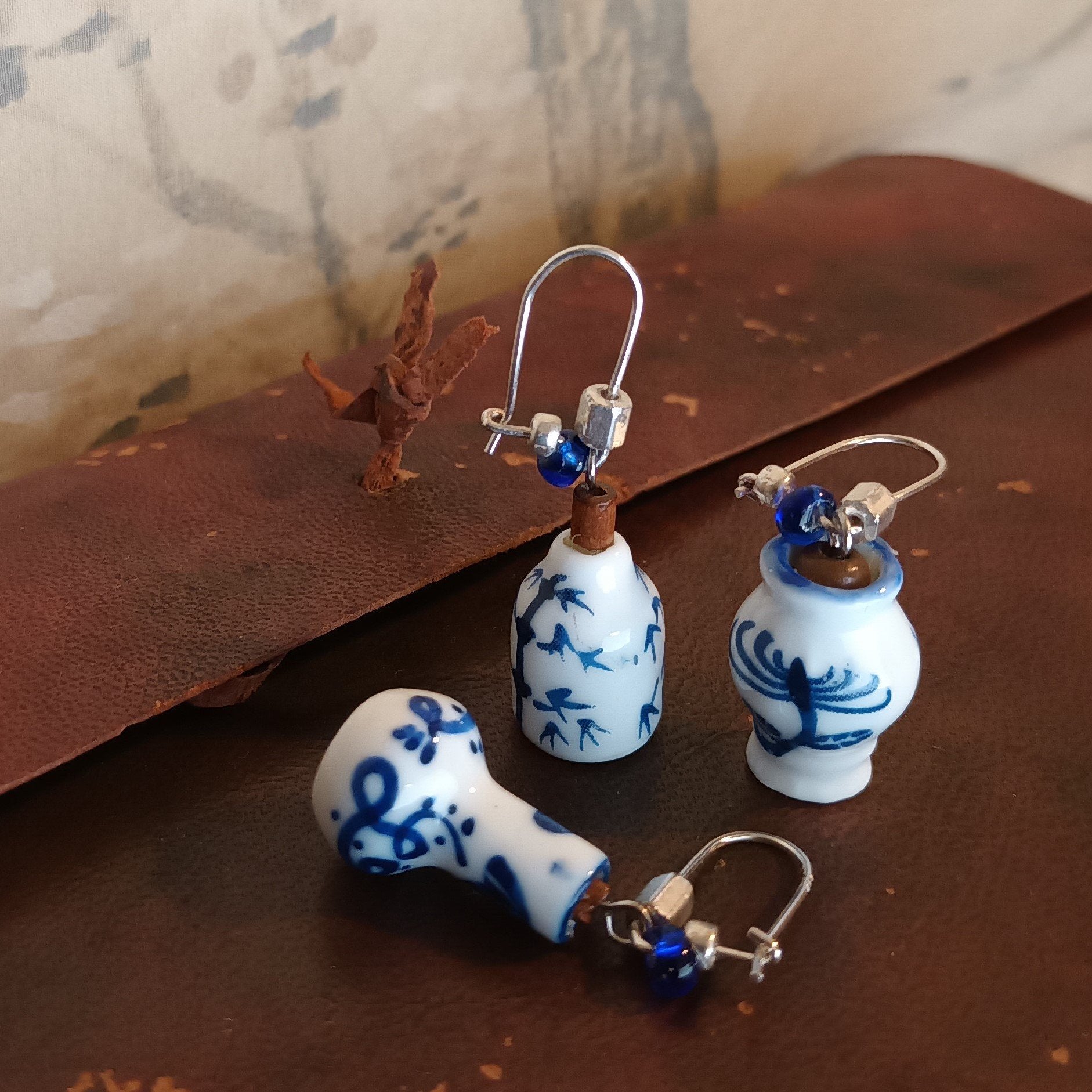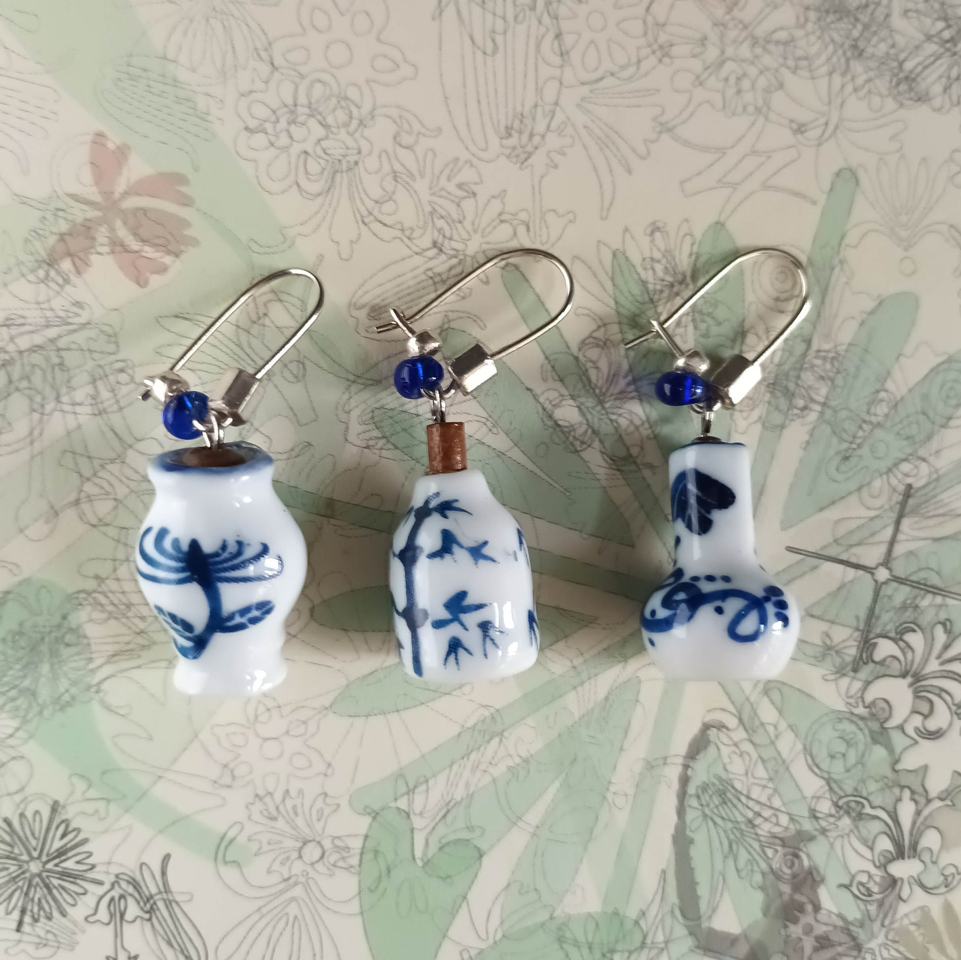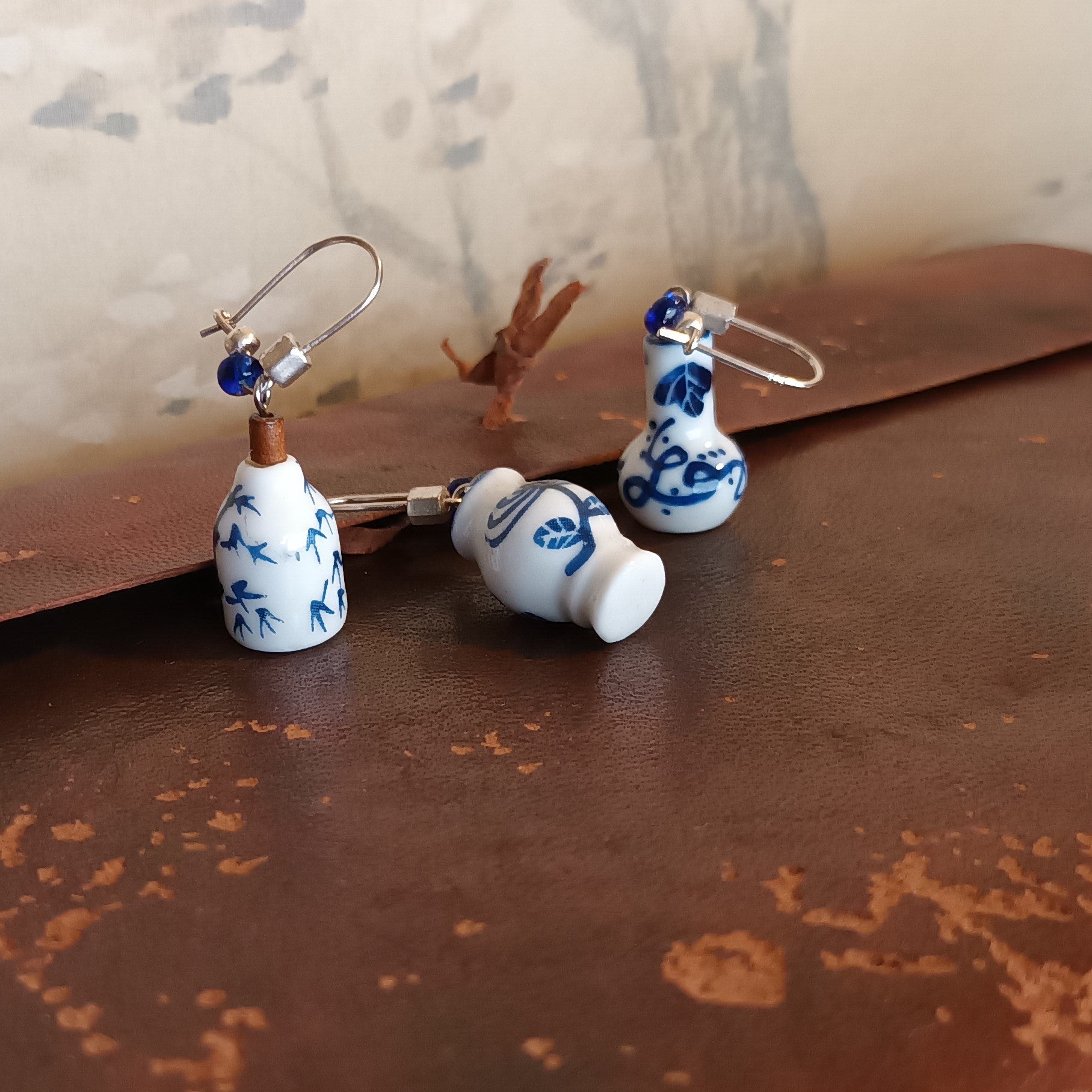 Delicate PICK & PAIR miniature Blue & White porcelain vase 925silver earrings ear pins