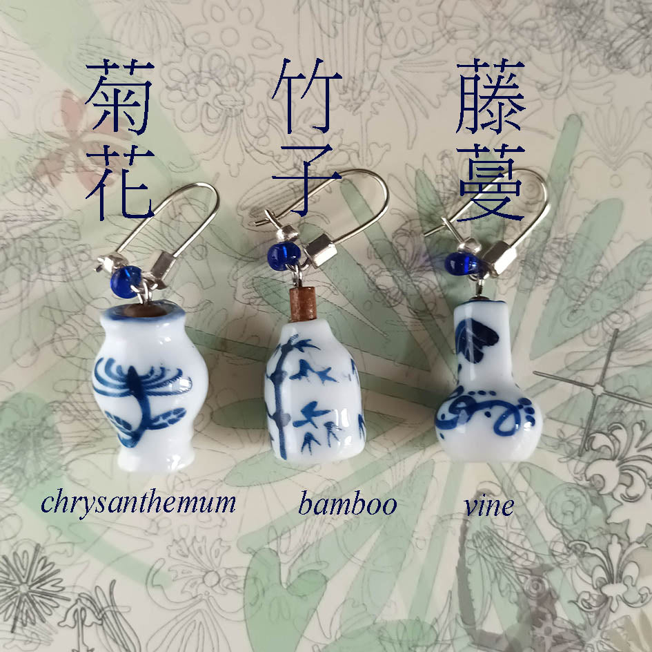 Playful pick and pair miniature earring collection presents this blue and white porcelain miniature vase 925silver earrings ear pins. It contains 3 different shapes with hand draw patterns of bamboo, chrysanthemum and vine for you to choose any of two to form a pair of your own style.