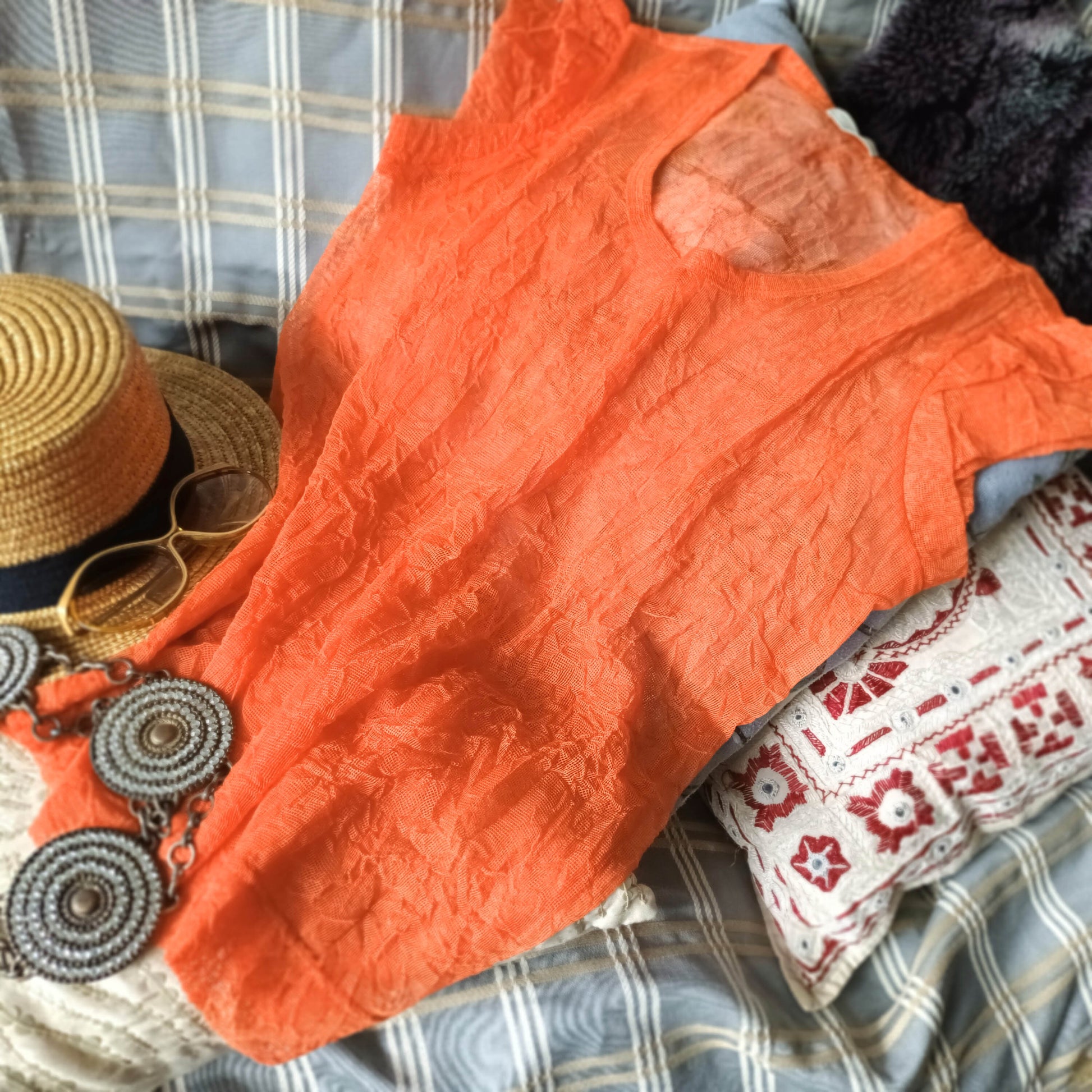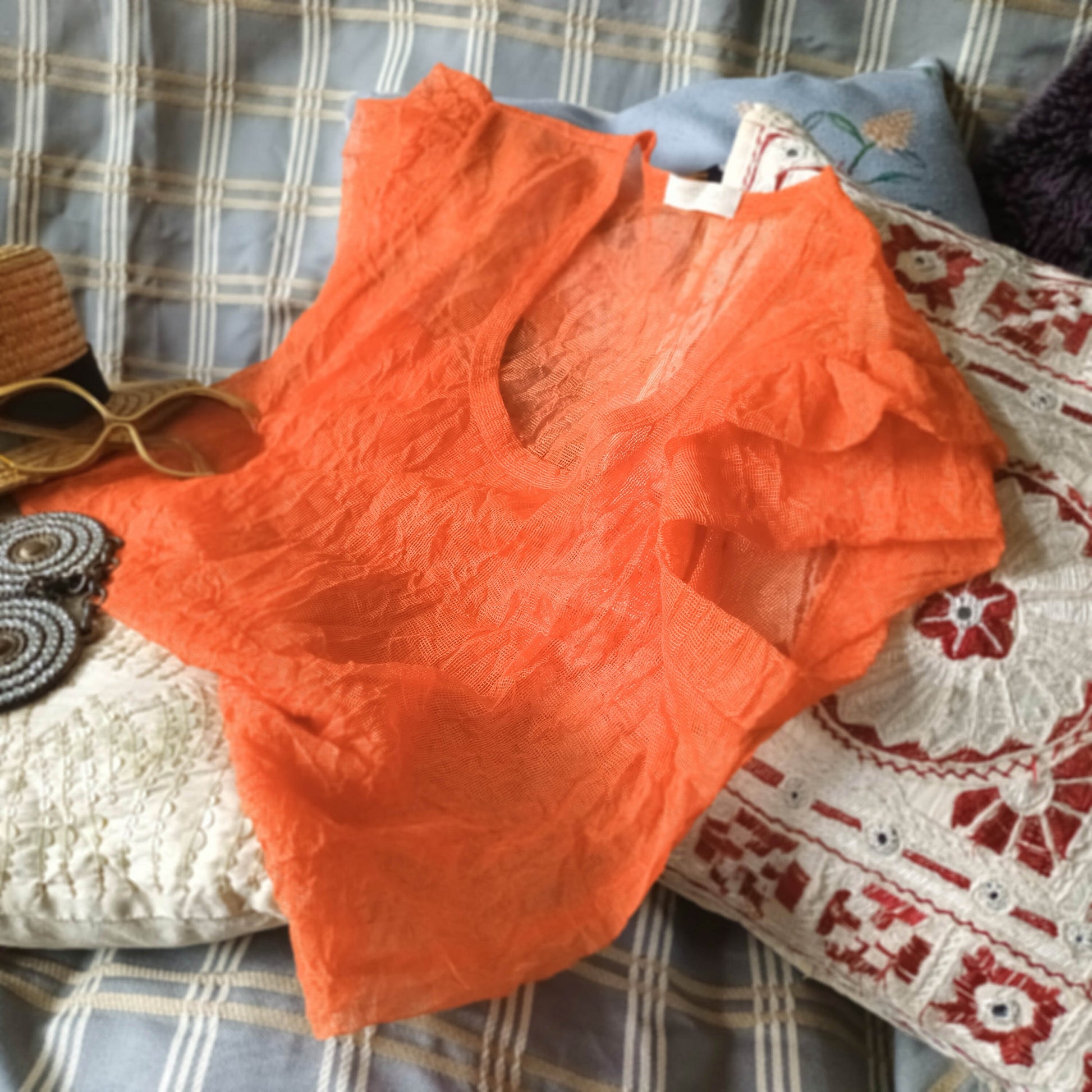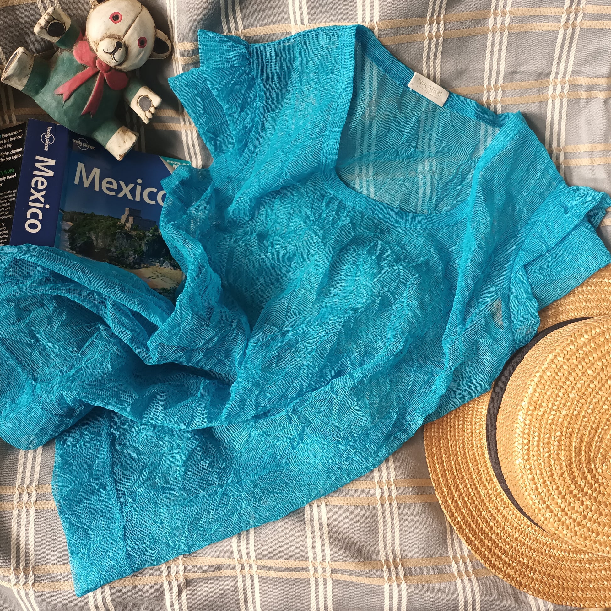 這款用料為日本皺紋網布的花瓣小蓋袖女裝上衣,具彈性和透視效果. 皺紋自然持久, 易乾不易變形, 容易打理. 用不同內搭的衣服來演變出不同風格和配色. 百搭而多變好玩.