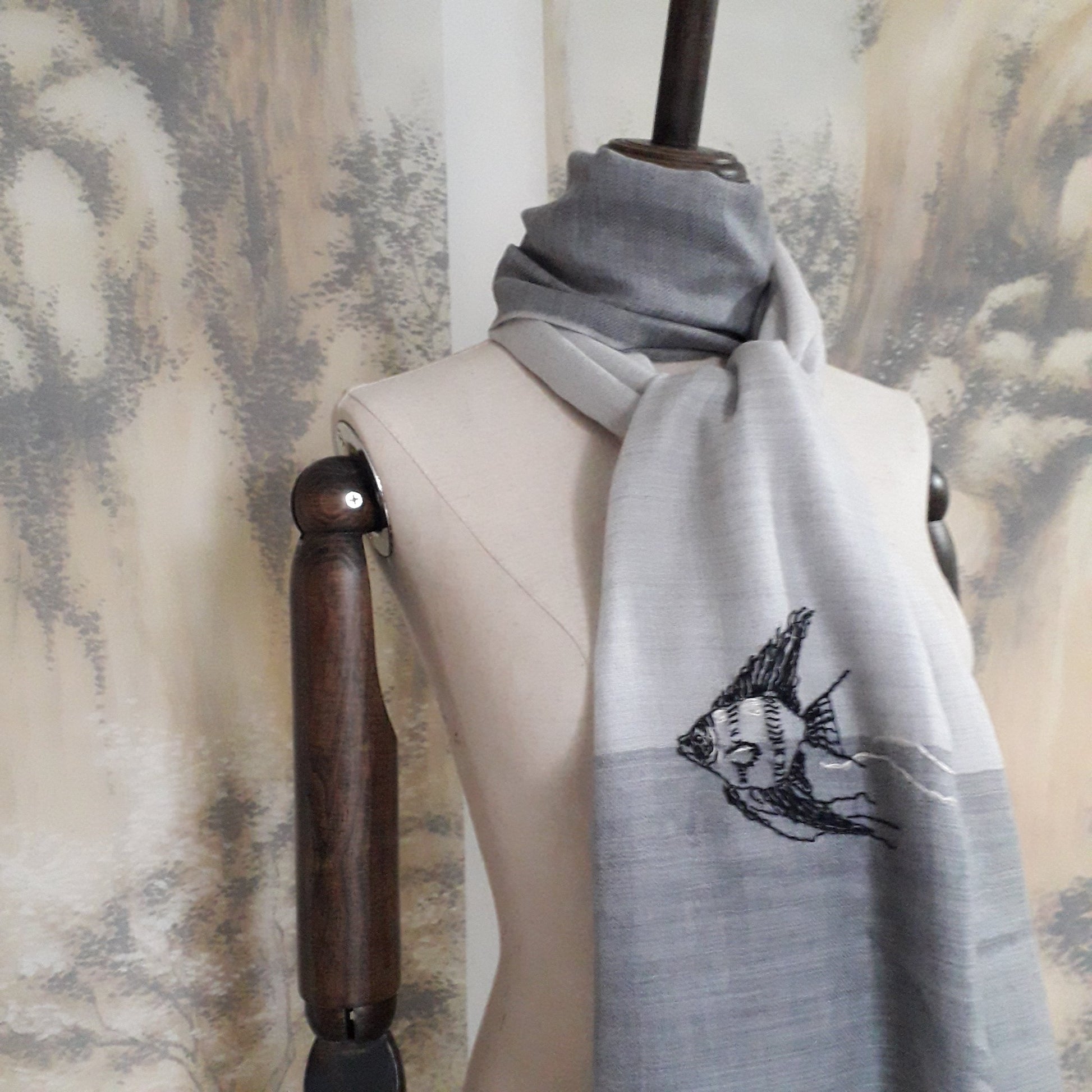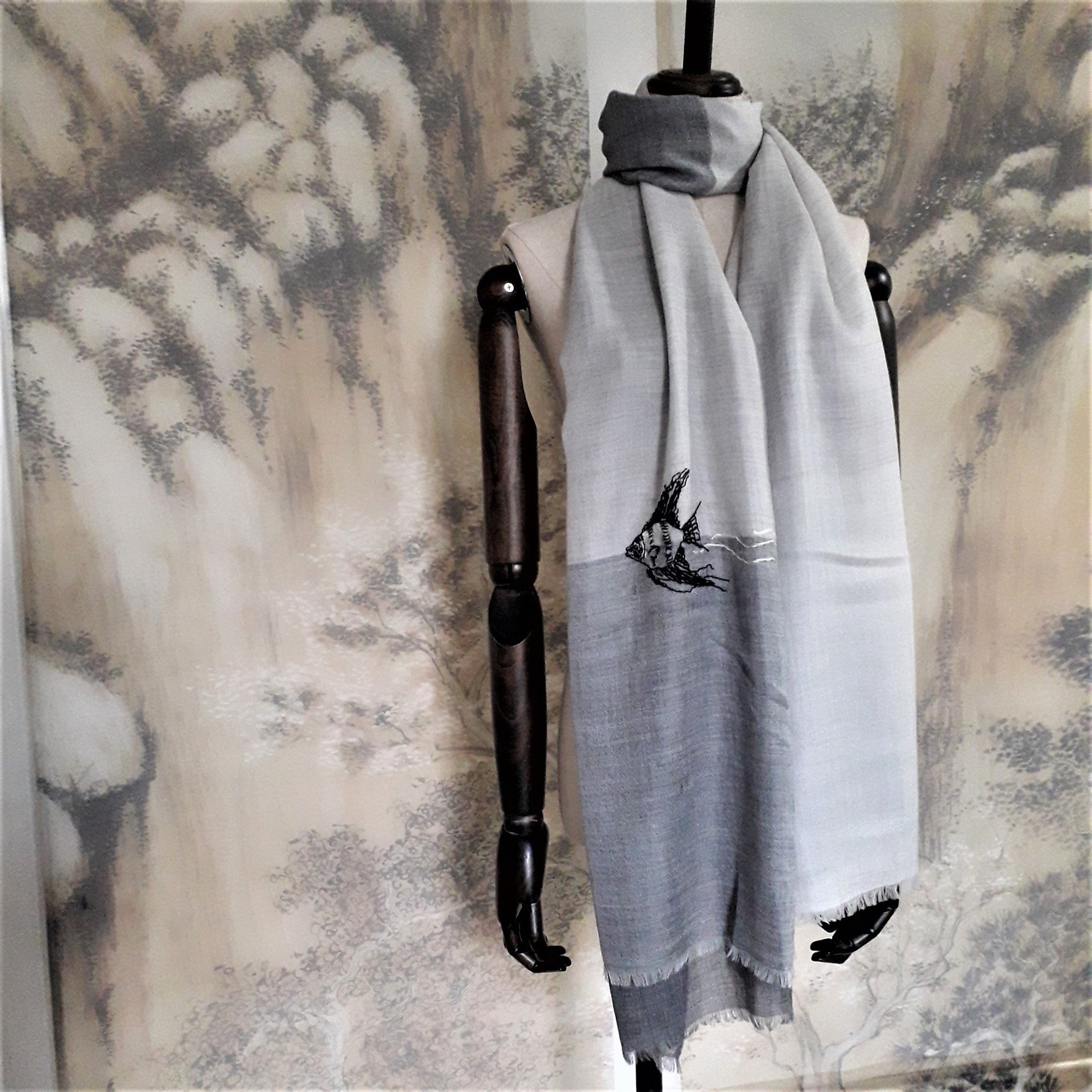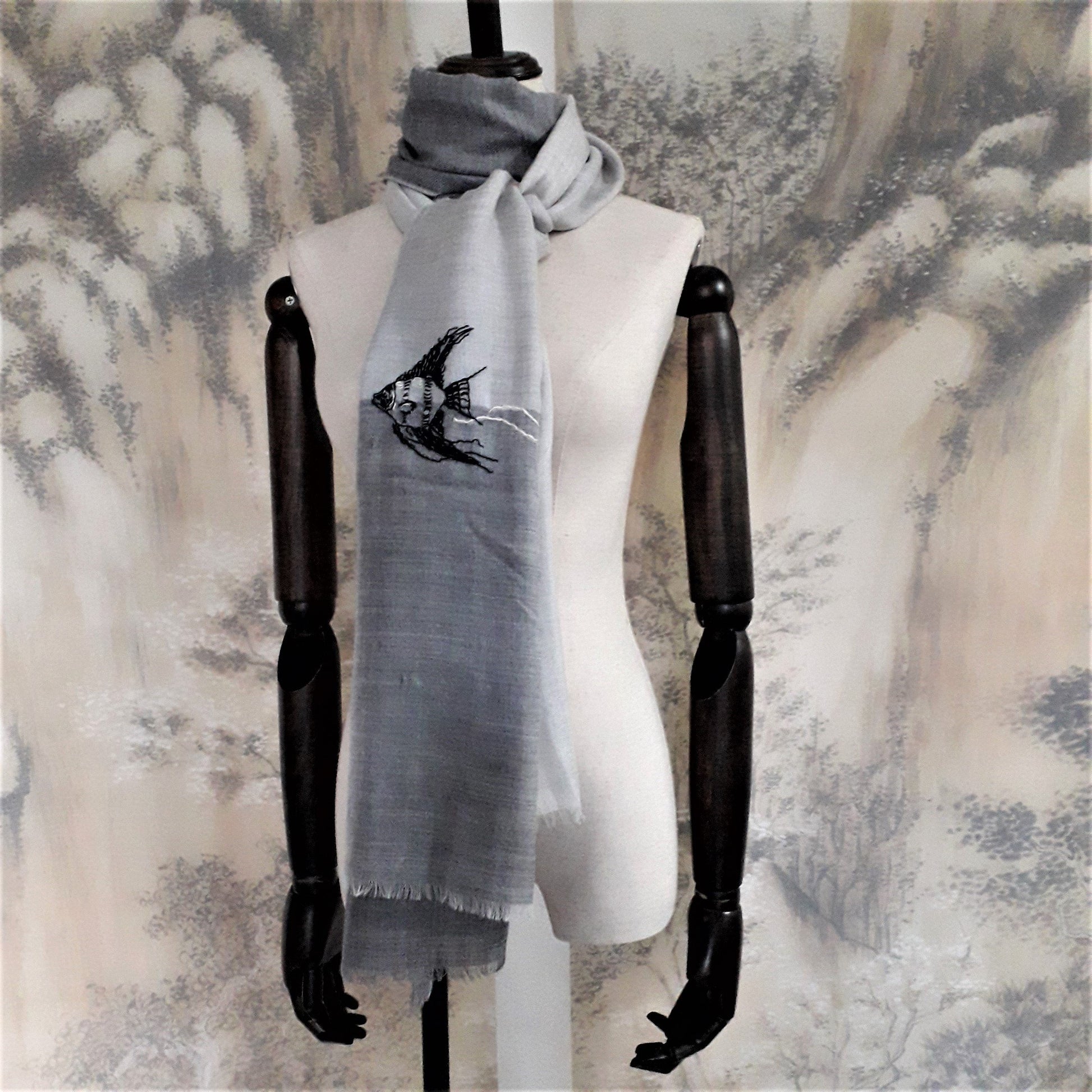 Hand embroidery angelfish pattern 300 super fine pure cashmere grey scarf