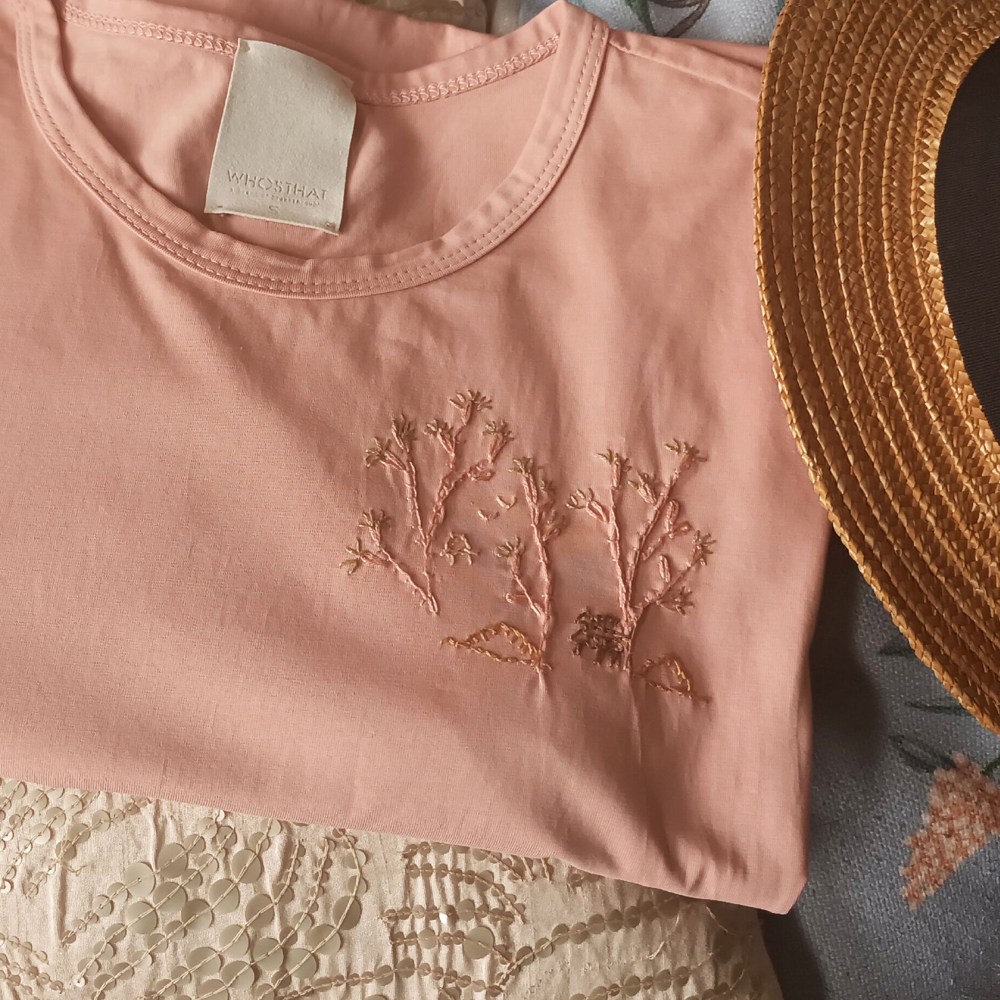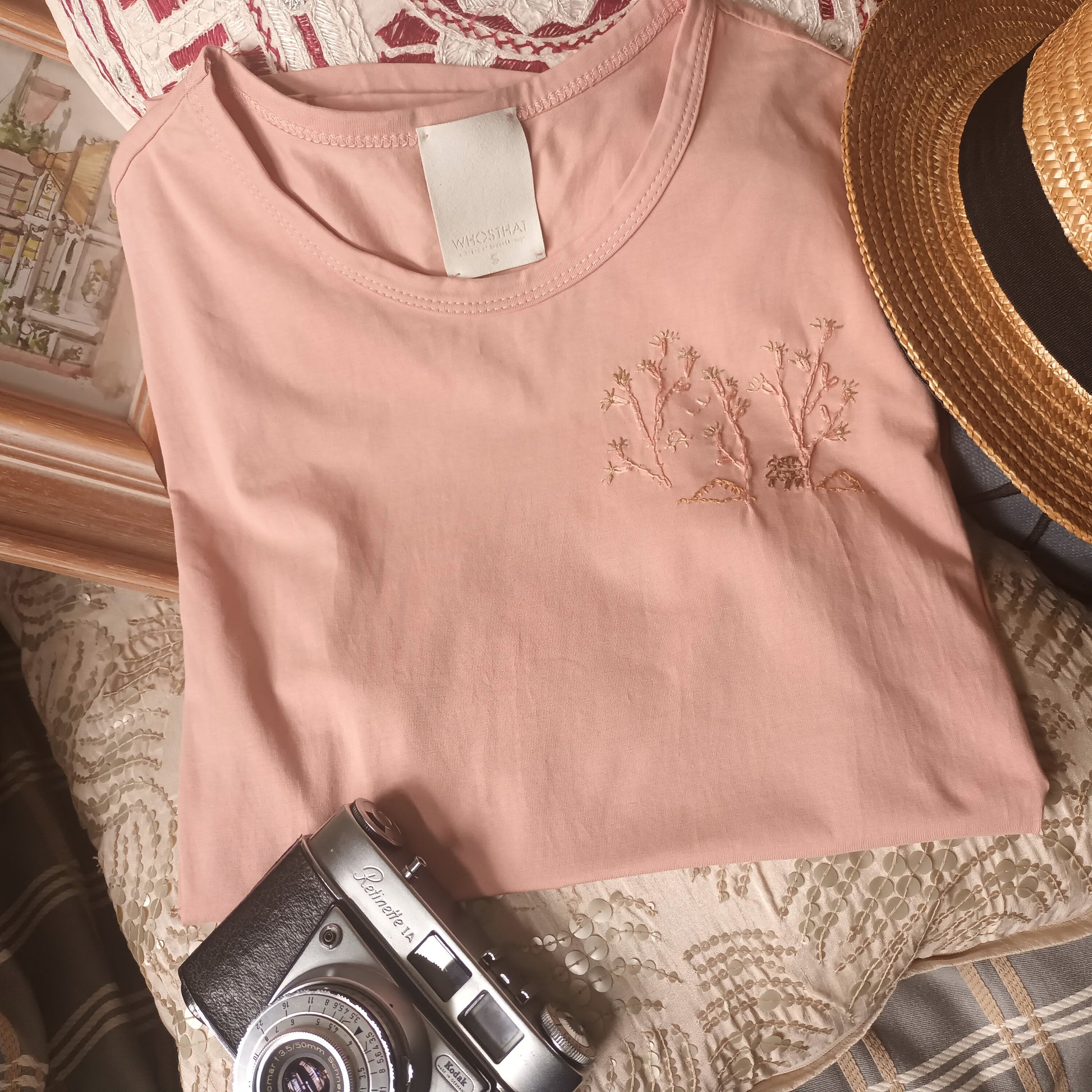 Hand embroidery village & UFO Basic straight cut high-end smart casual cotton tee