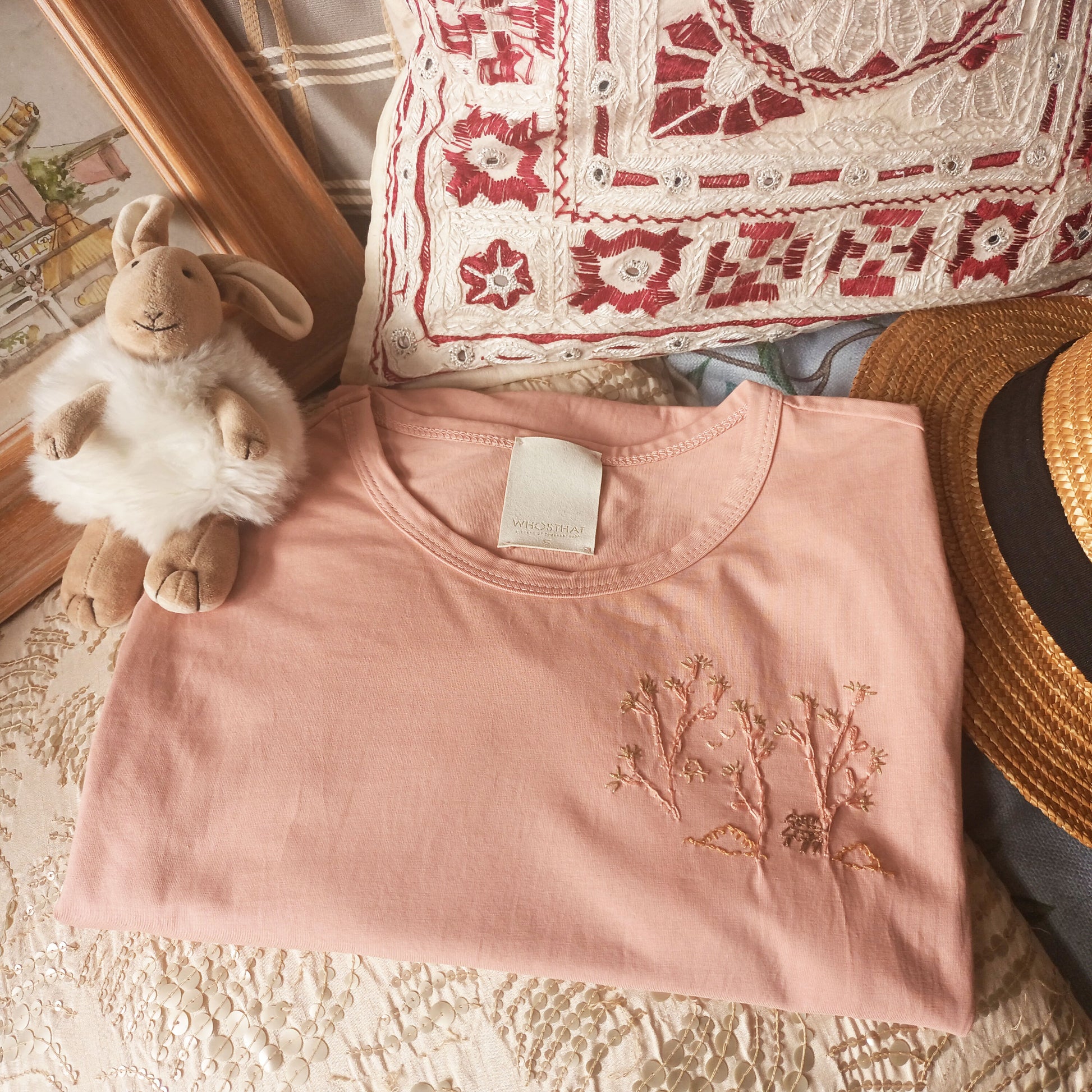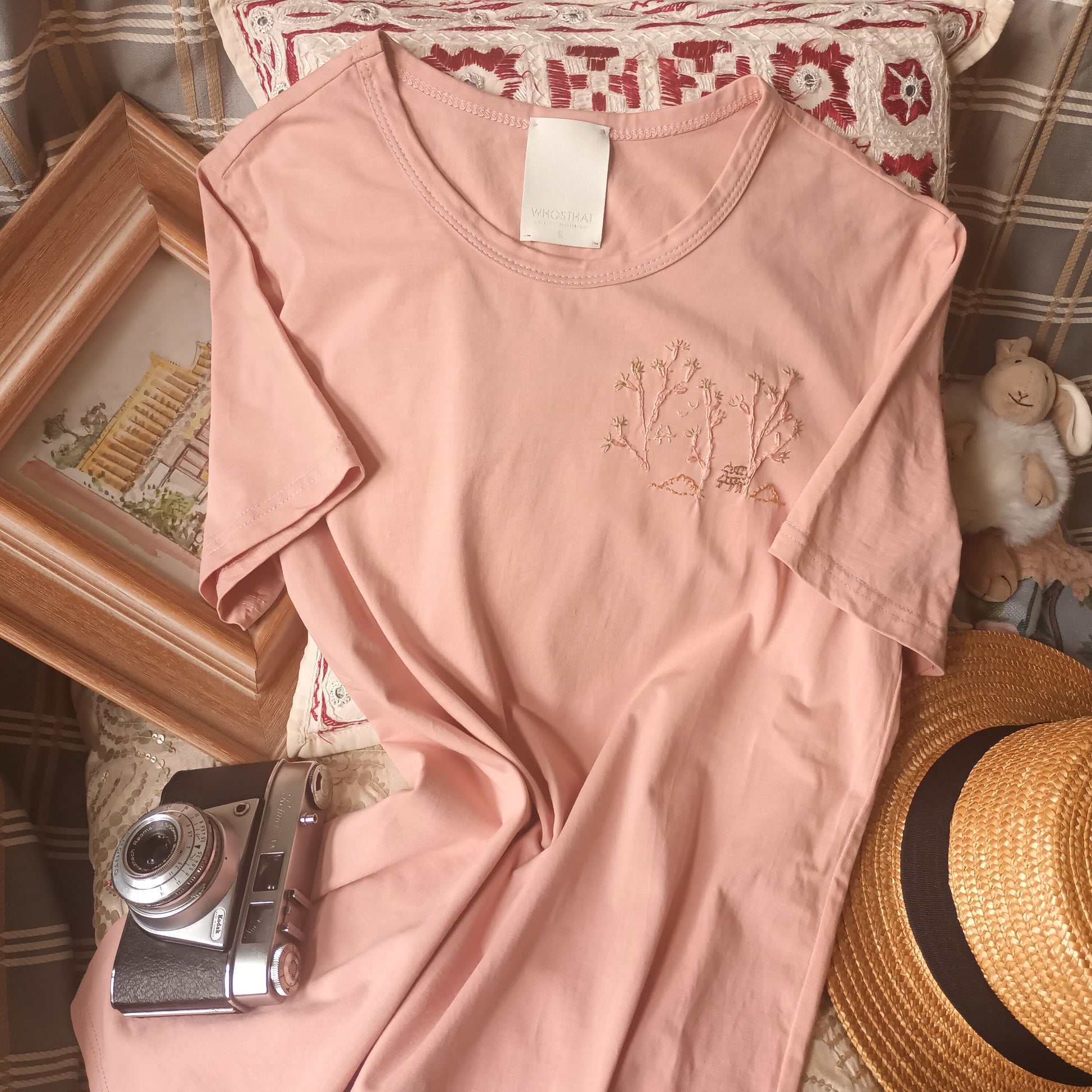Hand embroidery village & UFO, Basic straight cut high-end smart casual cotton tee