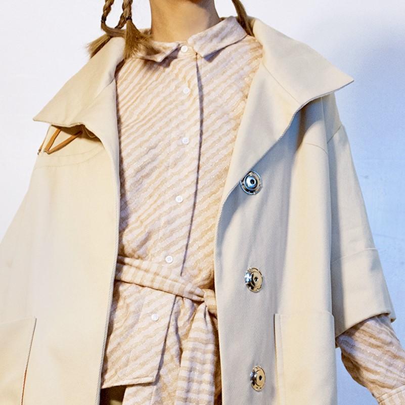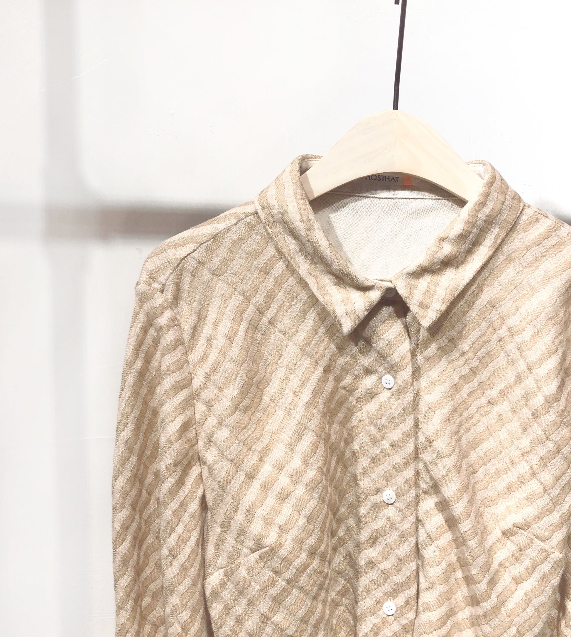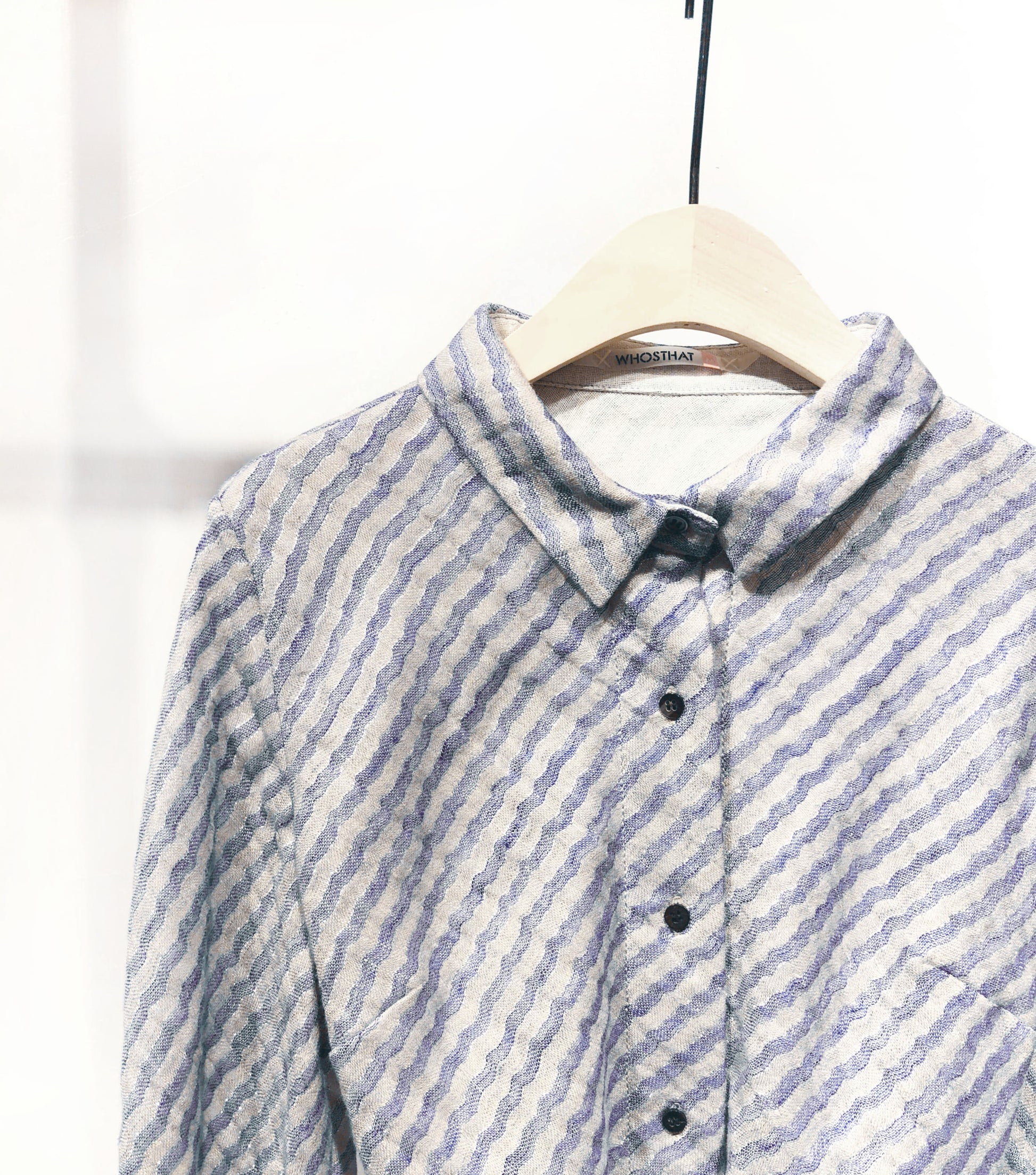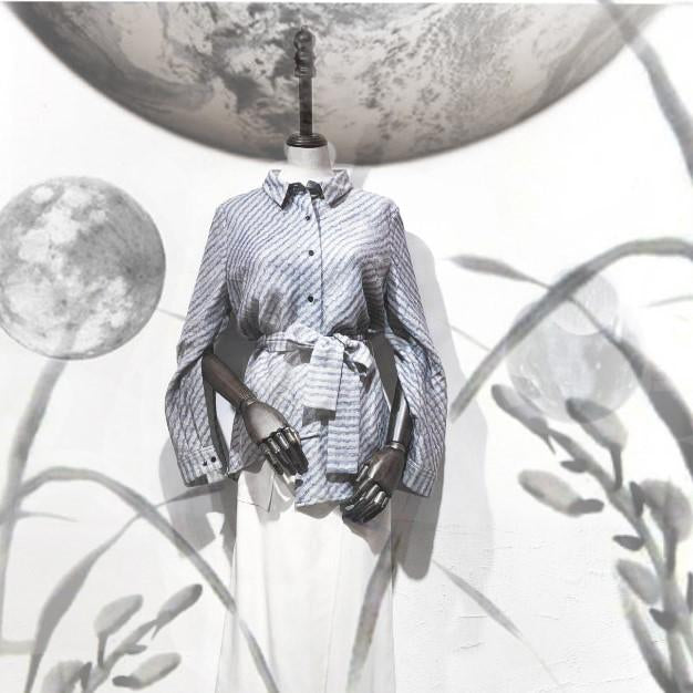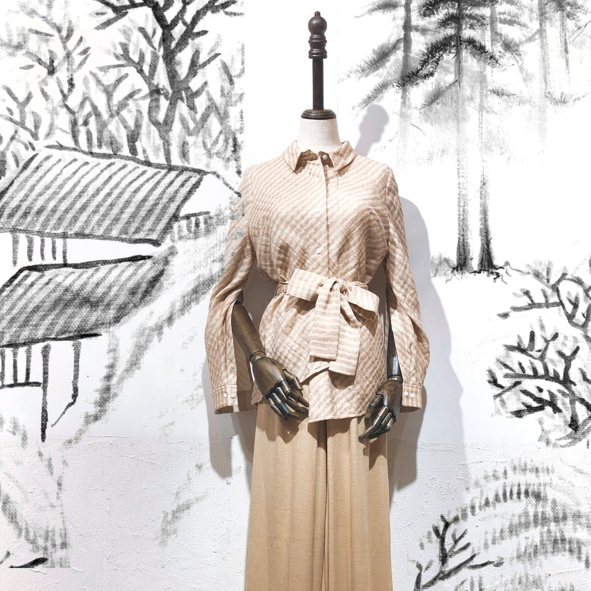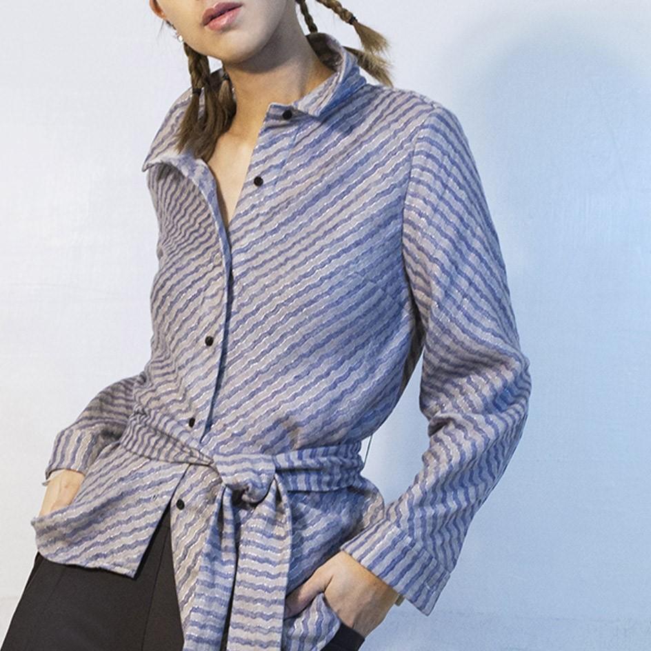 A soft structural belted blouse is made of Japan double layer cotton fabric which is soft with naturally crinkled glittering surface. It is featured by the uneven hem, long sleeve slits give a sense of relax, and modern chic. The self fabric stripe belt would be used as neck tie.