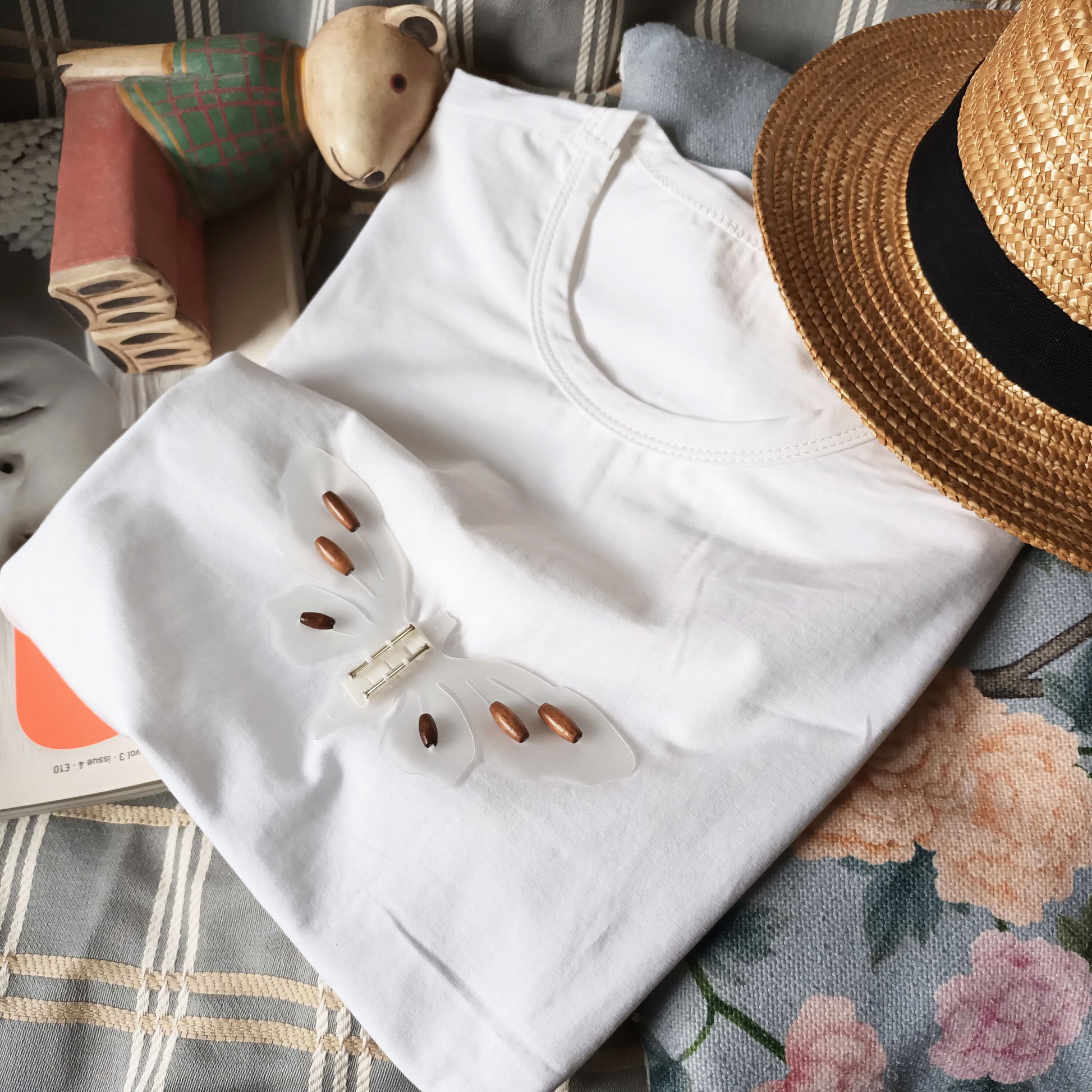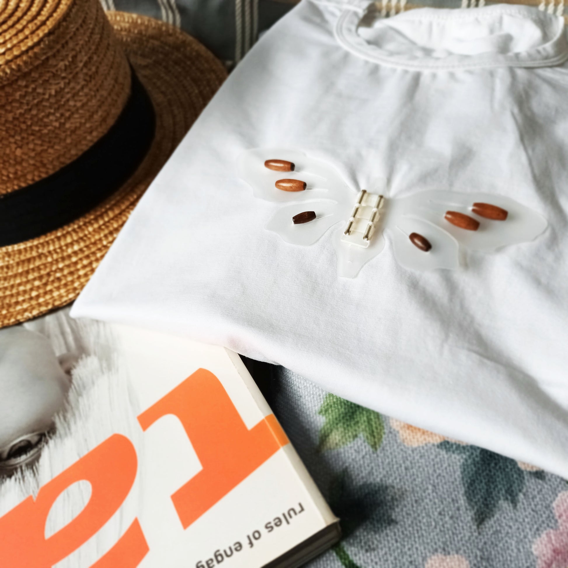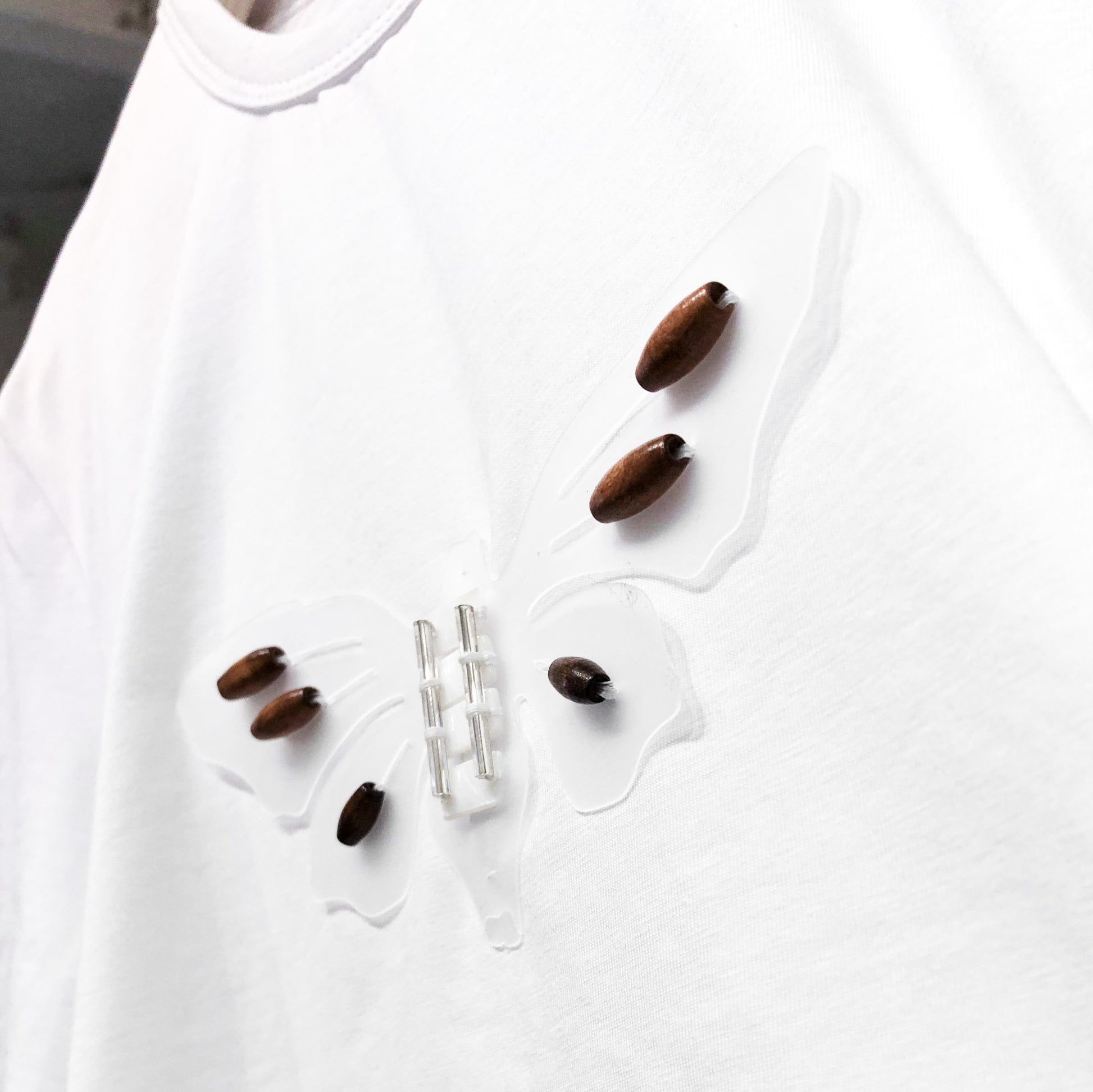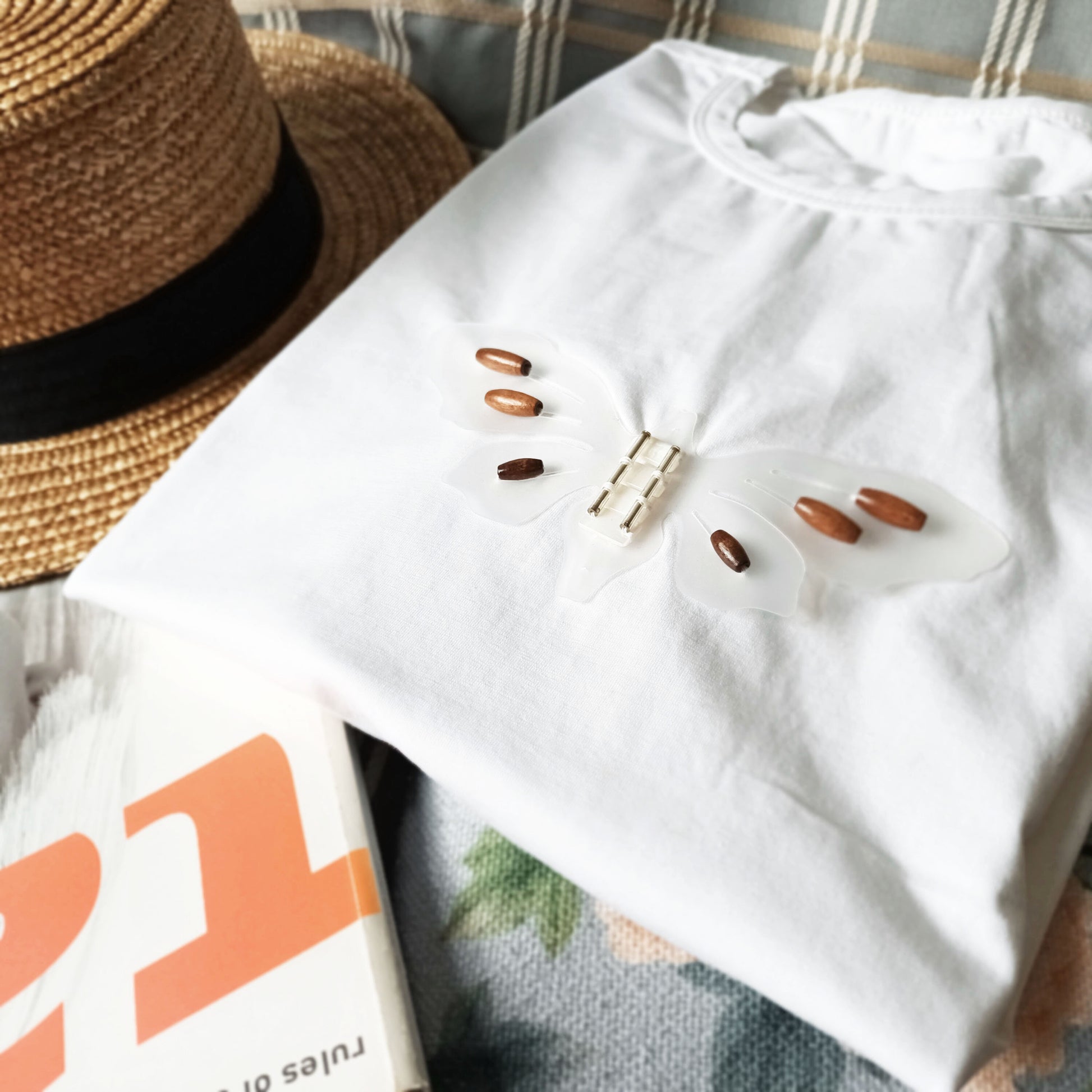 這時尚百搭手縫立體蝶圖案簡約直身棉彈高端 smart casual TEE, 利用EVA磨沙膠和小木珠這有趣新鮮的材質組合, 創作成簡約獨特的蝴蝶圖案, 手縫在前中, 蝴蝶立體精緻.
