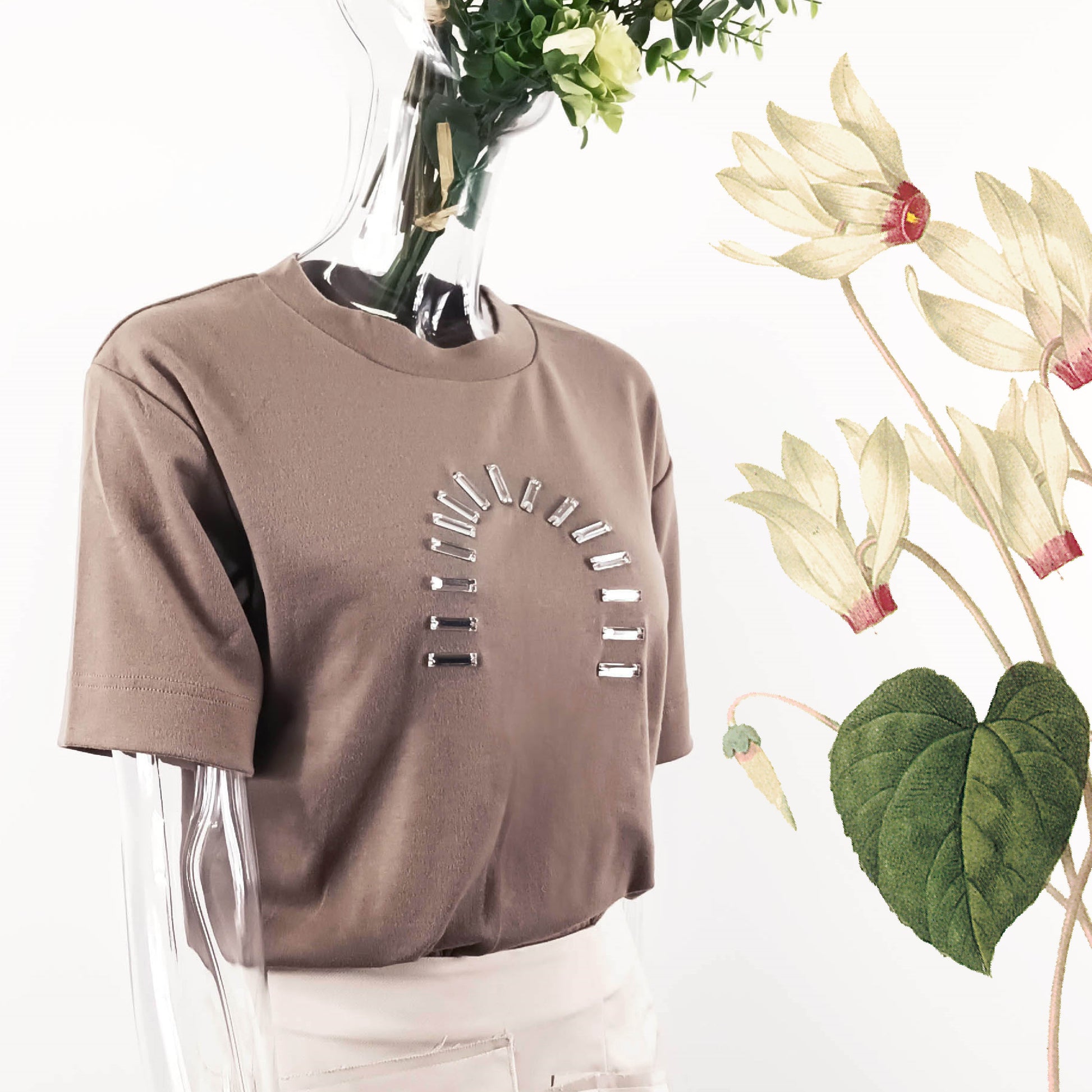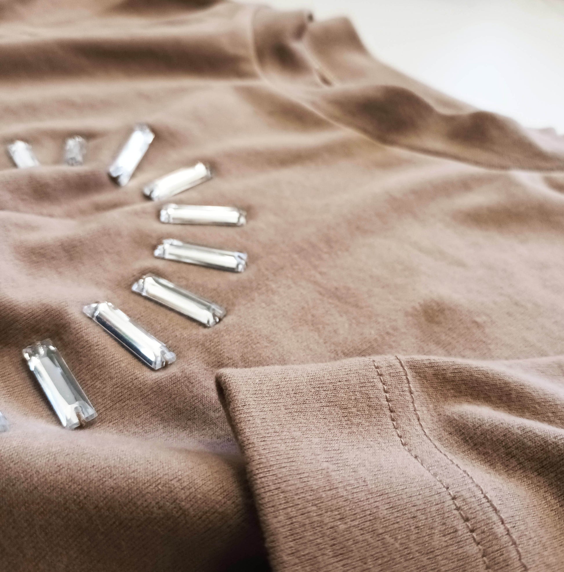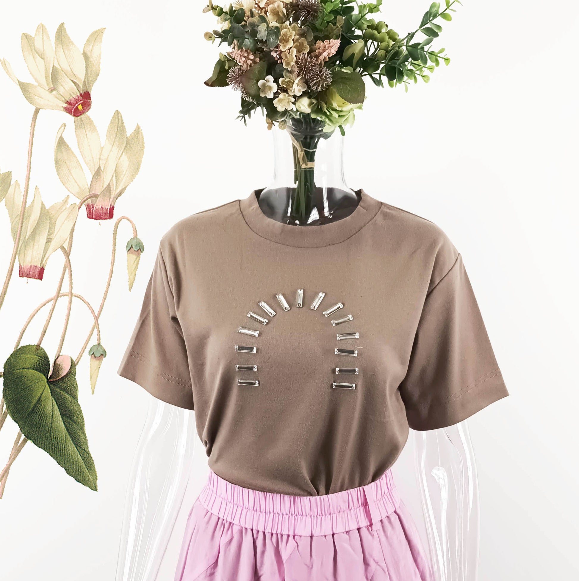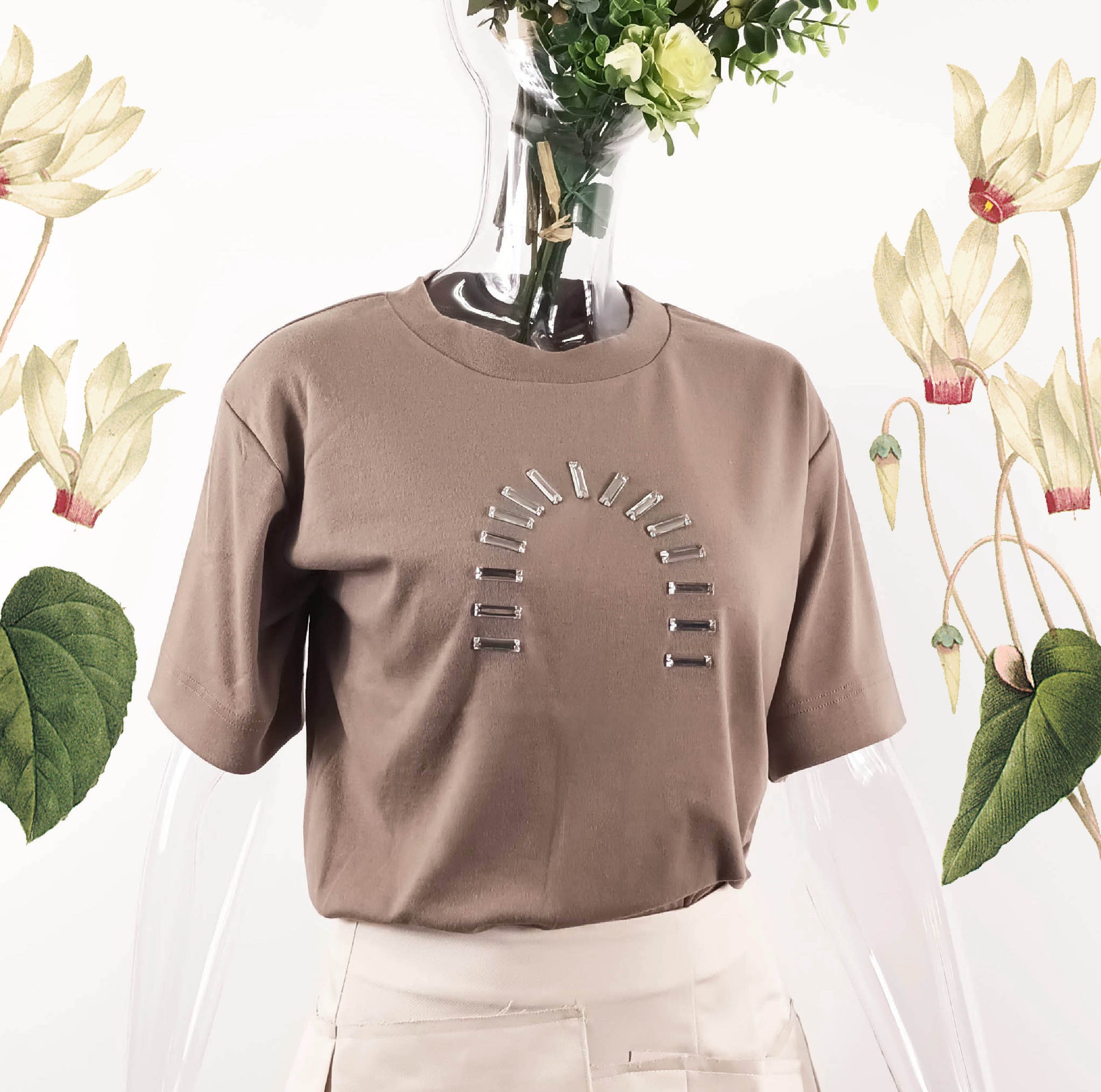 這款百搭簡約可跨季穿搭的百搭磨毛鬆身圓領TEE, 前中用閃亮的銀色珠手縫成立體的拱門圖案, 磨毛棉面料柔軟暖和, 舒適, 針步細密. 除了傳統的大地色, 奶茶啡是亦可搭配糖果色, 是灰色以外的時尚百搭色. 夏未時單穿, 秋冬時可外搭大衣外套, 實行跨季穿搭.