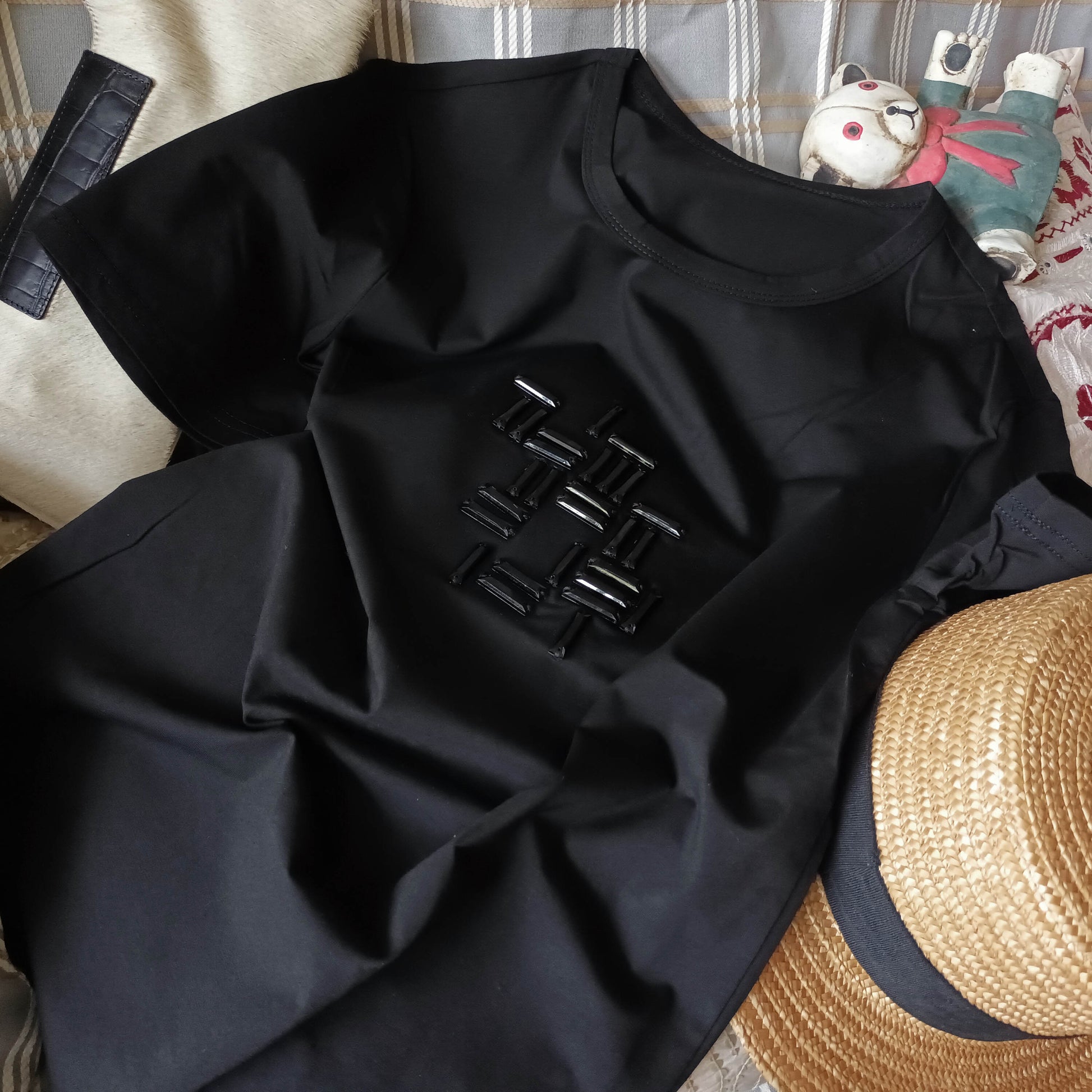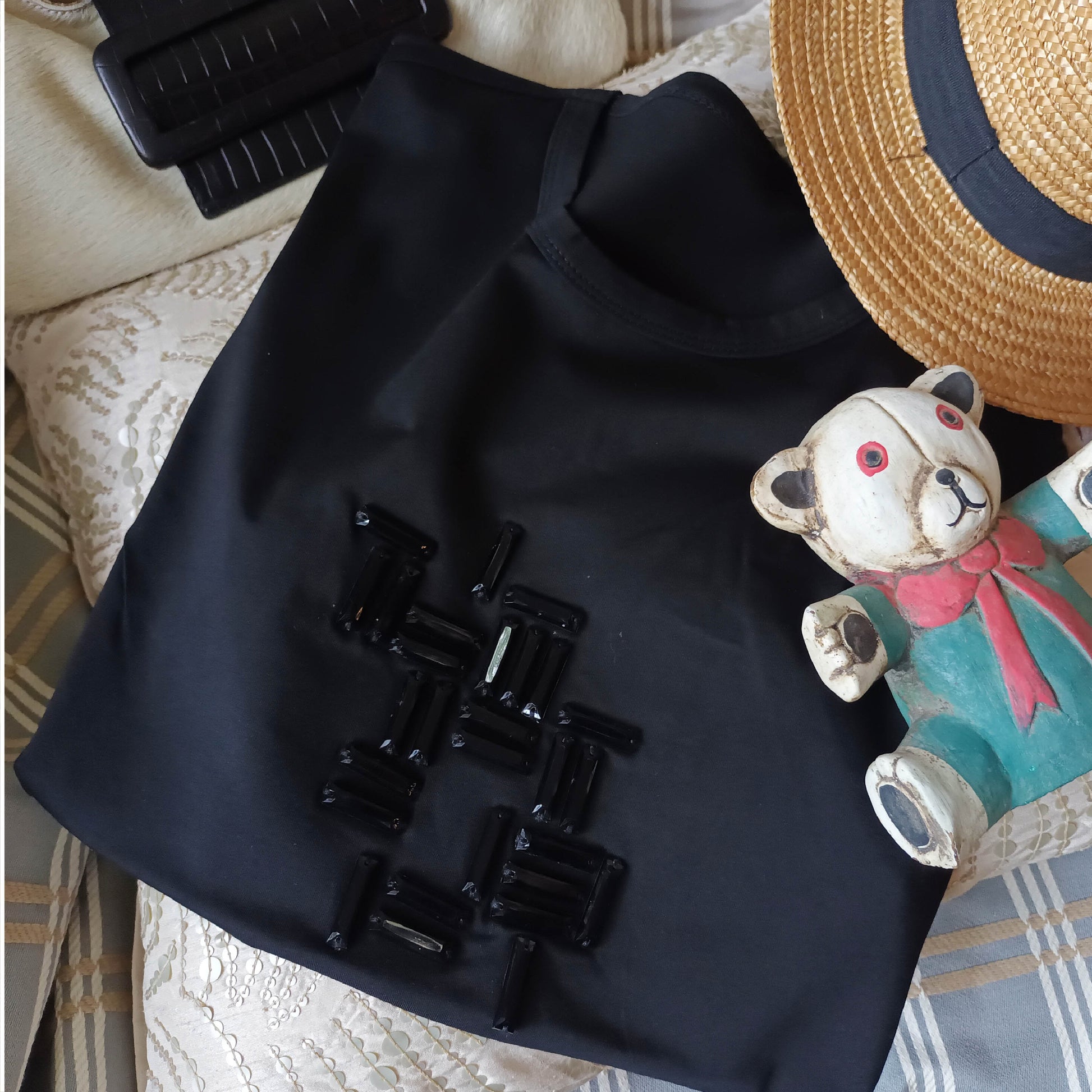 This straight cut basic high-end smart casual TEE shirt is made of cotton stretch, hand-sewn big black rectangular beads into three-dimensional and exquisite pattern, fashionable, high-end and easy-to-match. Cotton spandex material is specially smooth, soft and skin-friendly, which is an excellent choice for smart casual besides printed TEE.