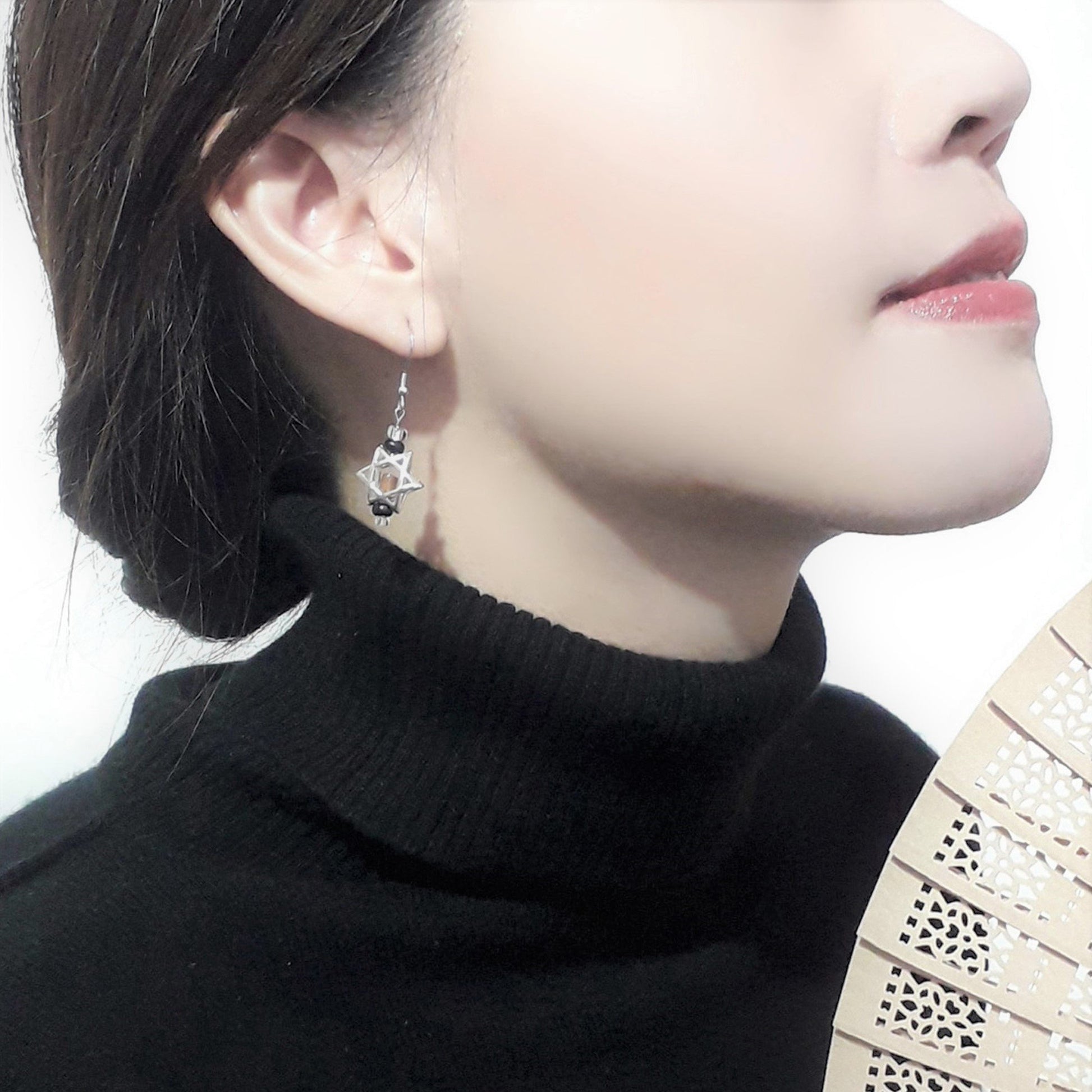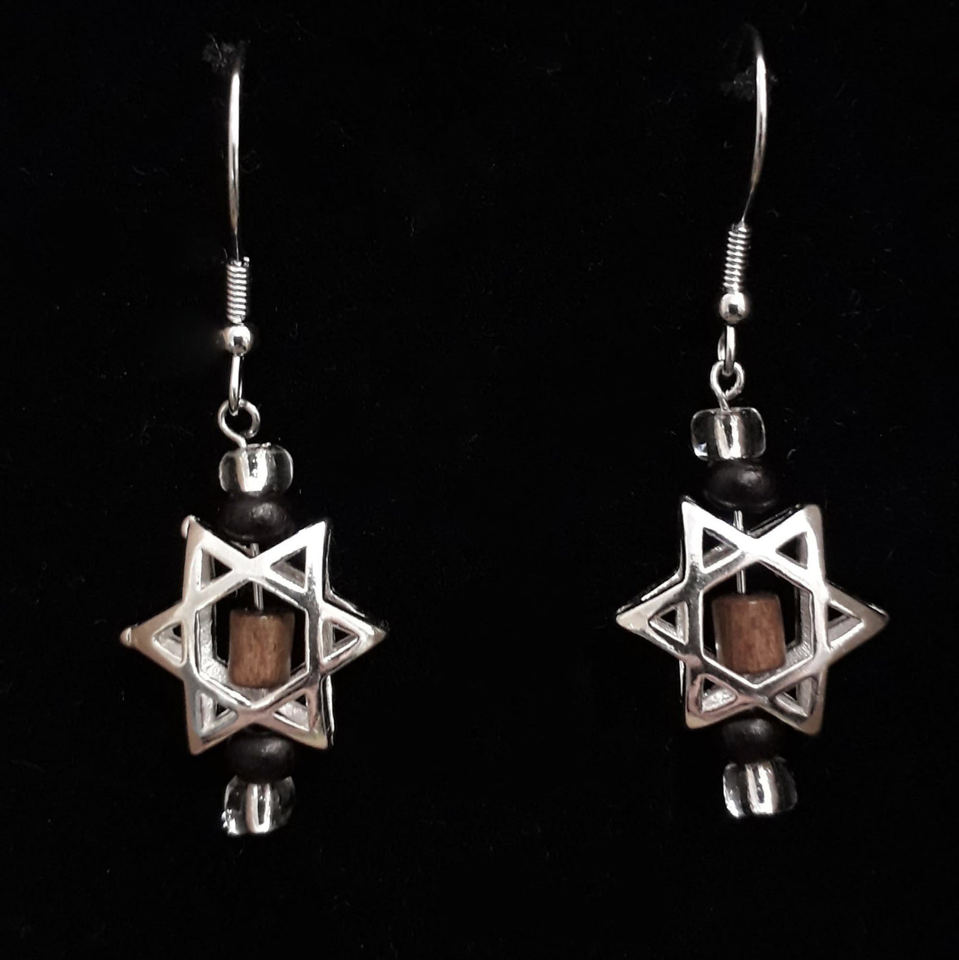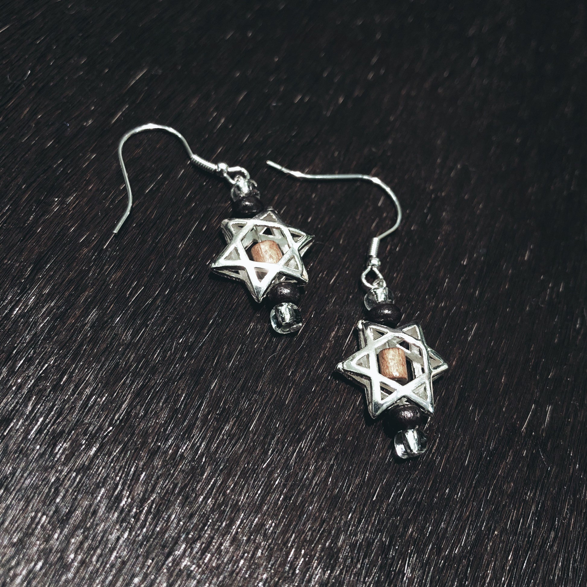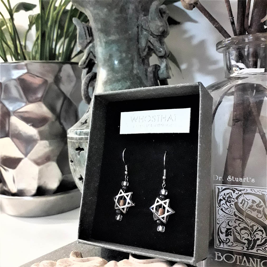 The Star of David also known as the shield or Armour of King David. Its hexagram shape is the compound of 2 equilateral triangles. The upward triangle representing the open sky, and the triangle facing downward evokes the earth. WHOSTHAT designer put a tiny wood bead in the middle symbolize the core of the planet is nature, should be respected and protected.