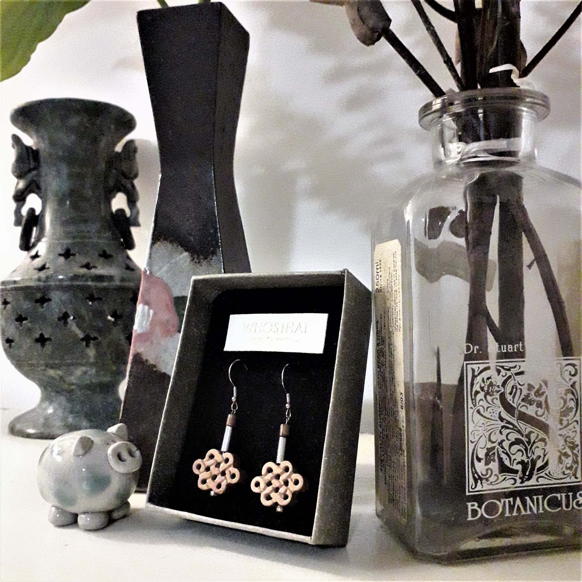 WHOSTHAT designers use peach wood to create this 925 silver platinum plated earrings, to delineate the humor and beauty of simplicity and modernity. Peach wood is the wood of peach tree, the tree of life, symbolize youth and immortality. Peach wood is believed to have the power warding off evil.