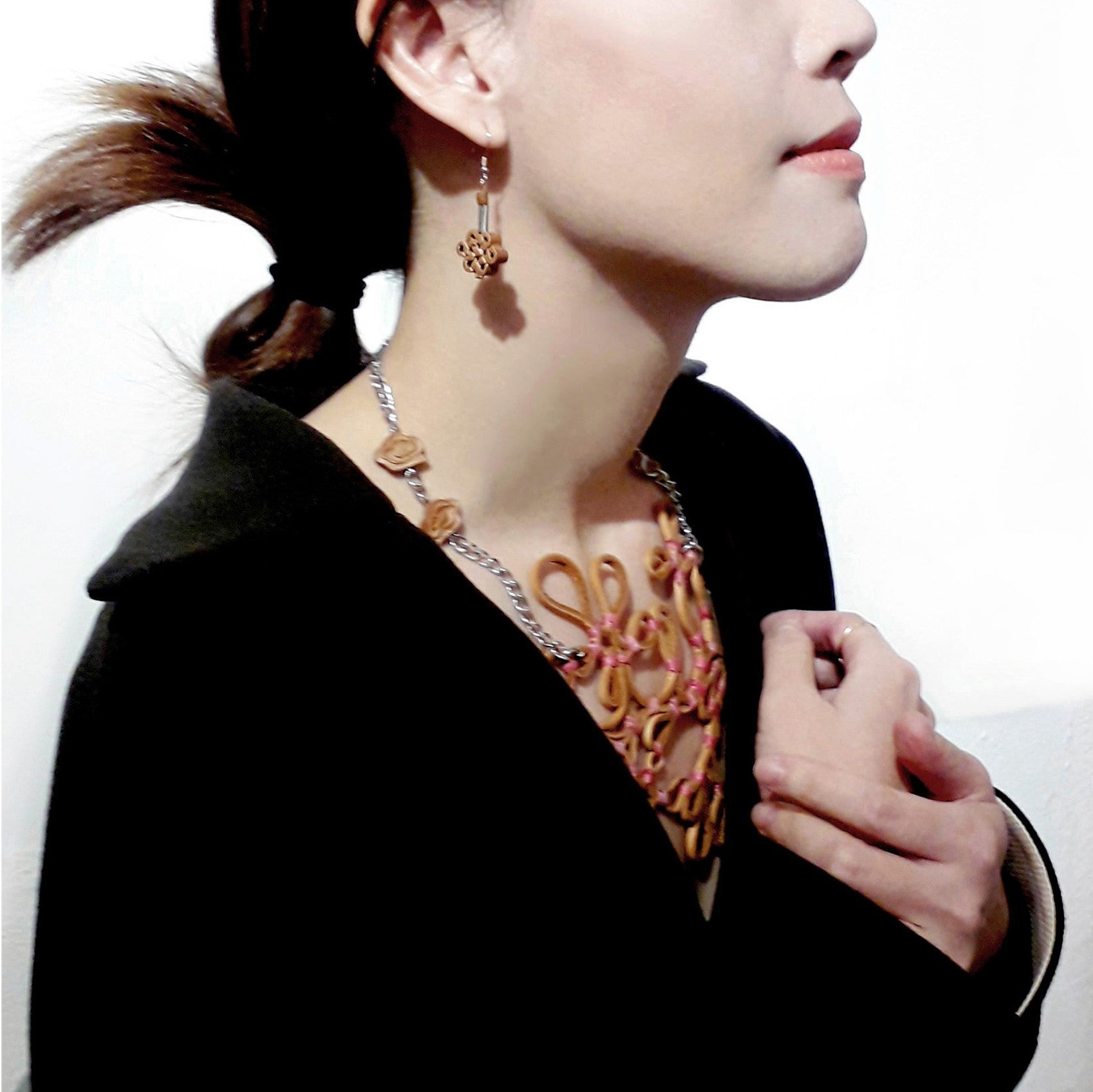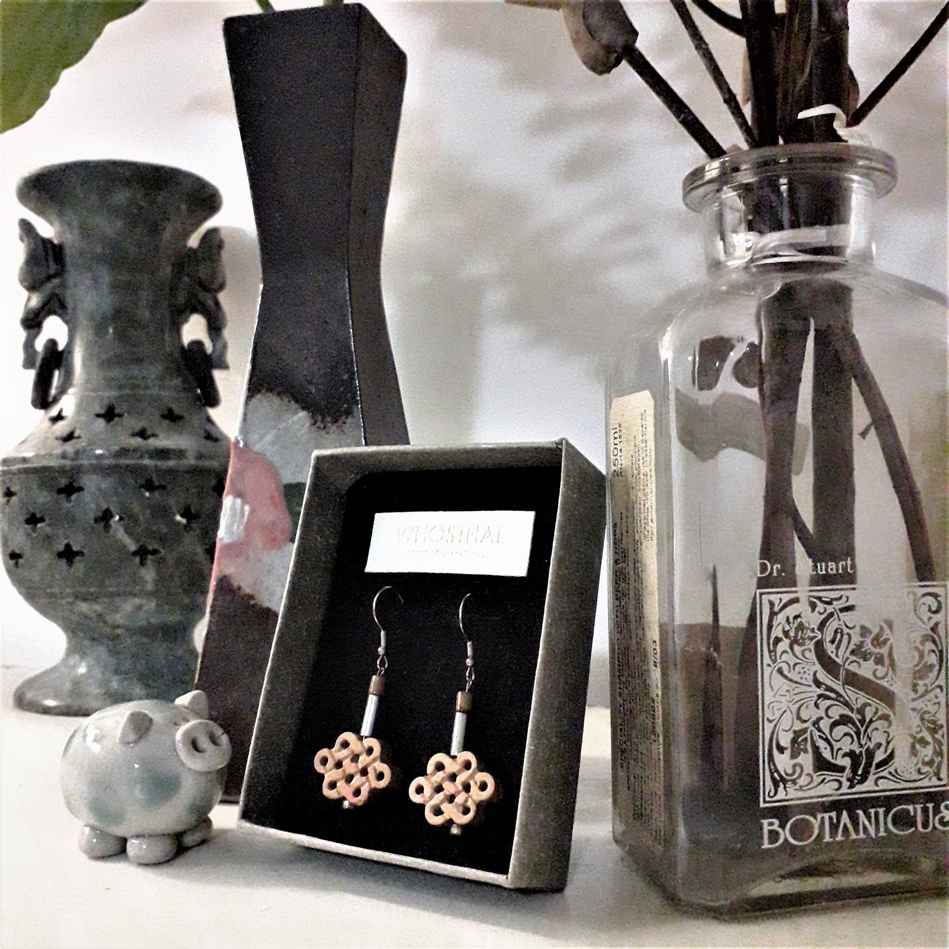 This pair of peach wood Jubilation knot crafted 925 silver earrings is a natural fragrance diffuser on-the-go. It utilizes wood's natural pores to absorb essential oils and diffuse gradually. After the scent fades, you can add essential oil to extend the diffusion of fragrance, or change the essential oil to alter the scent.