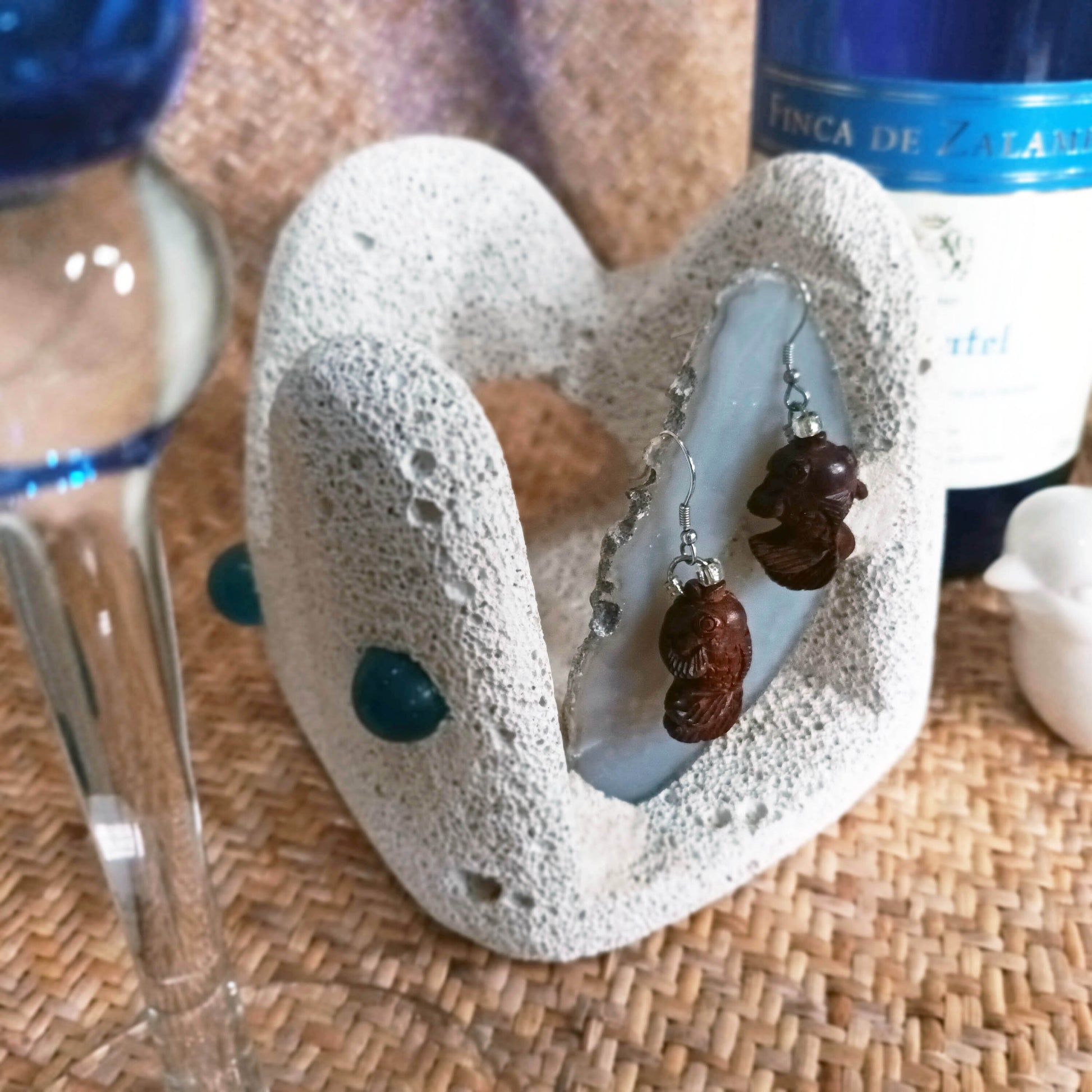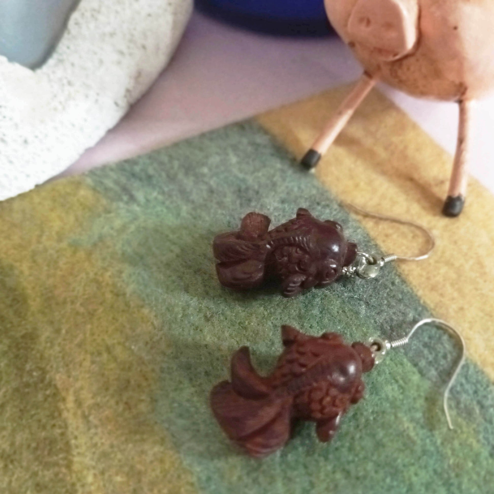 Scented red Sandalwood crafted smiling goldfish 925 silver platinum plated ear-pins