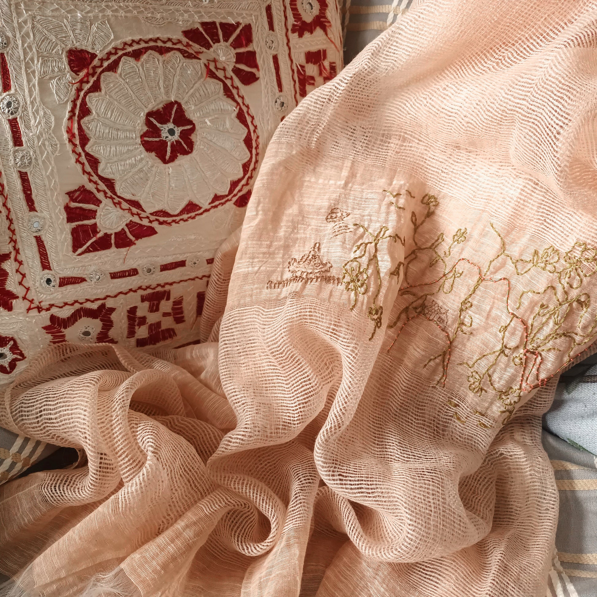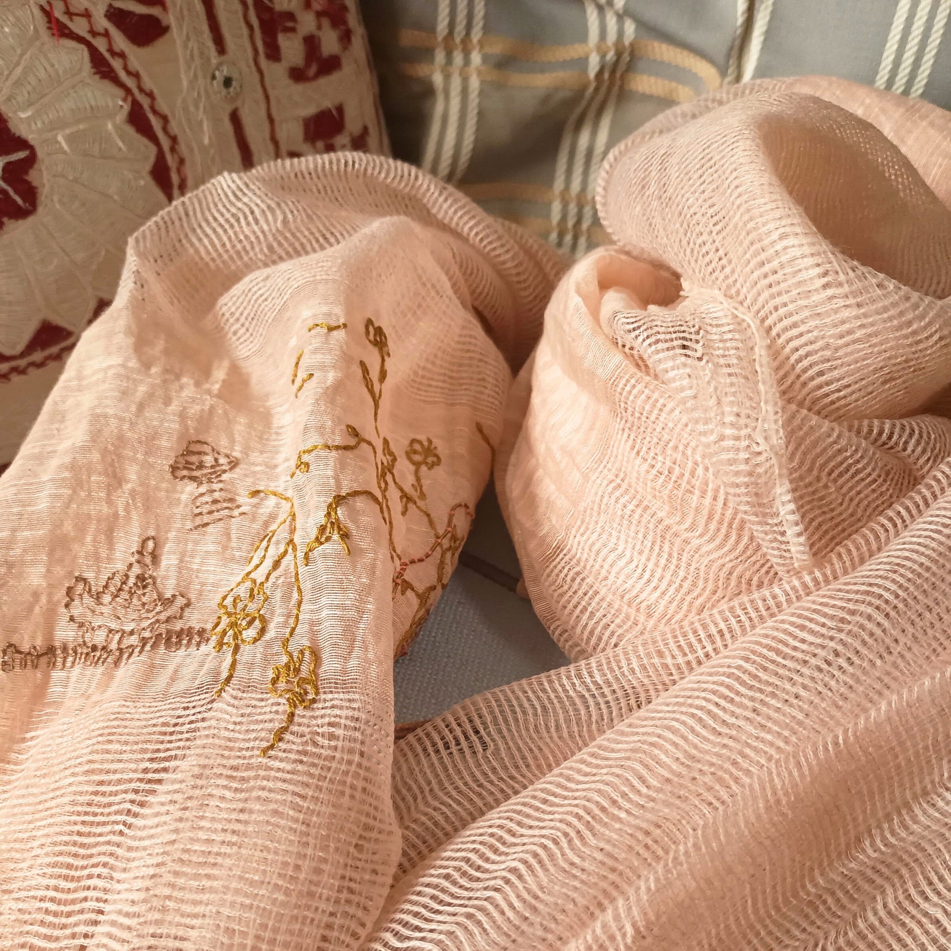 四季適用 可穿戴的藝術品 手工刺繡真絲混麻薄圍巾 幻想中的村落