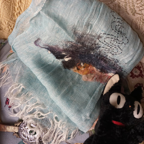 手工刺繡百搭真絲羊毛長薄圍巾 - 玉蘭花的遊樂場