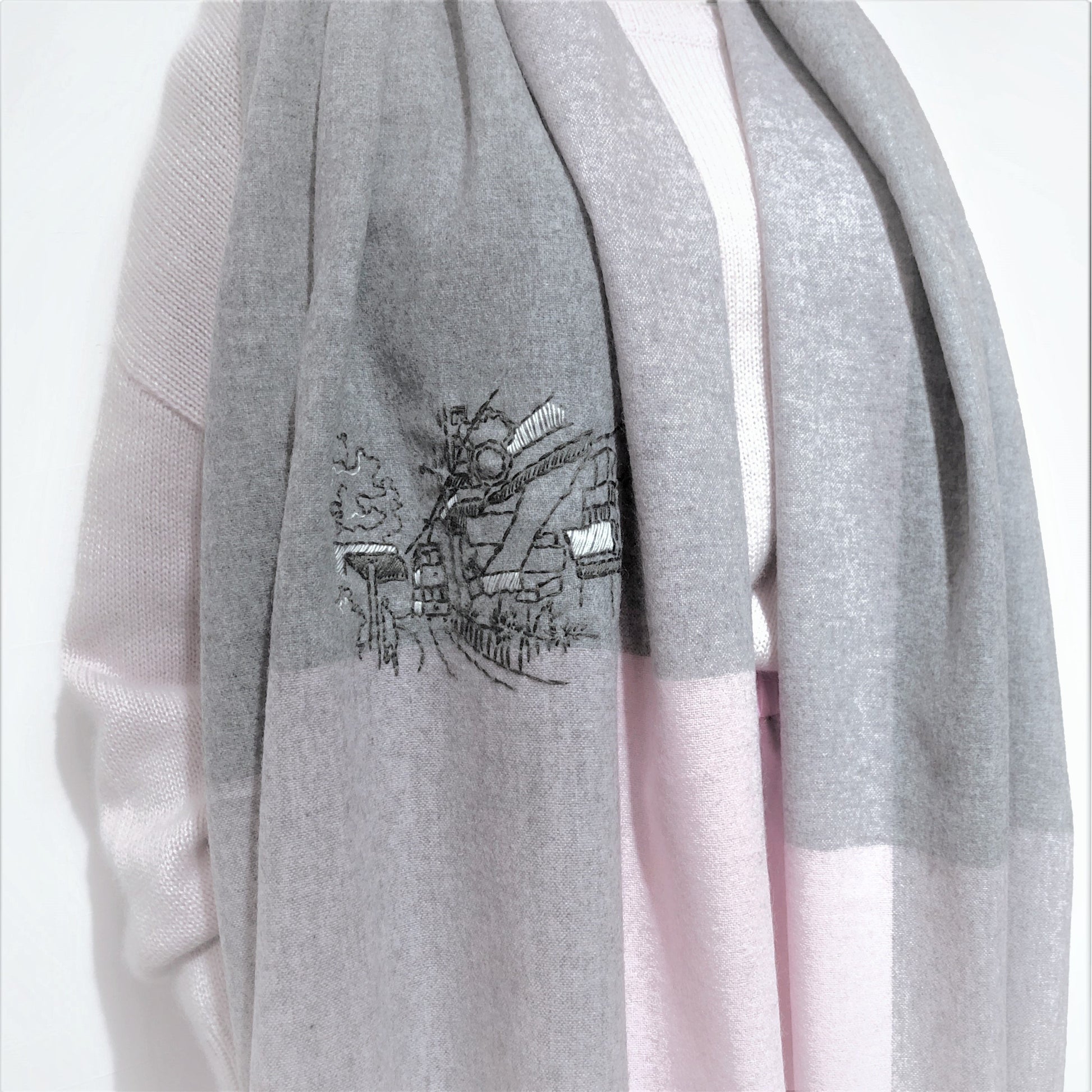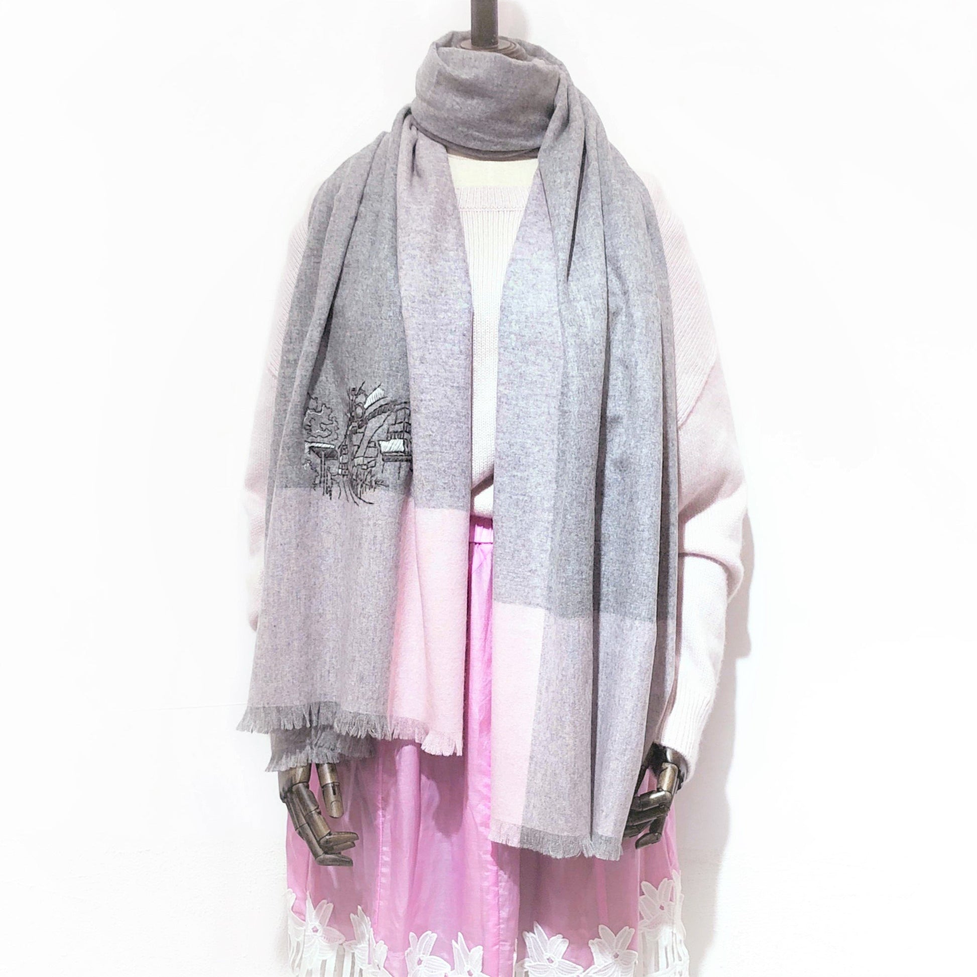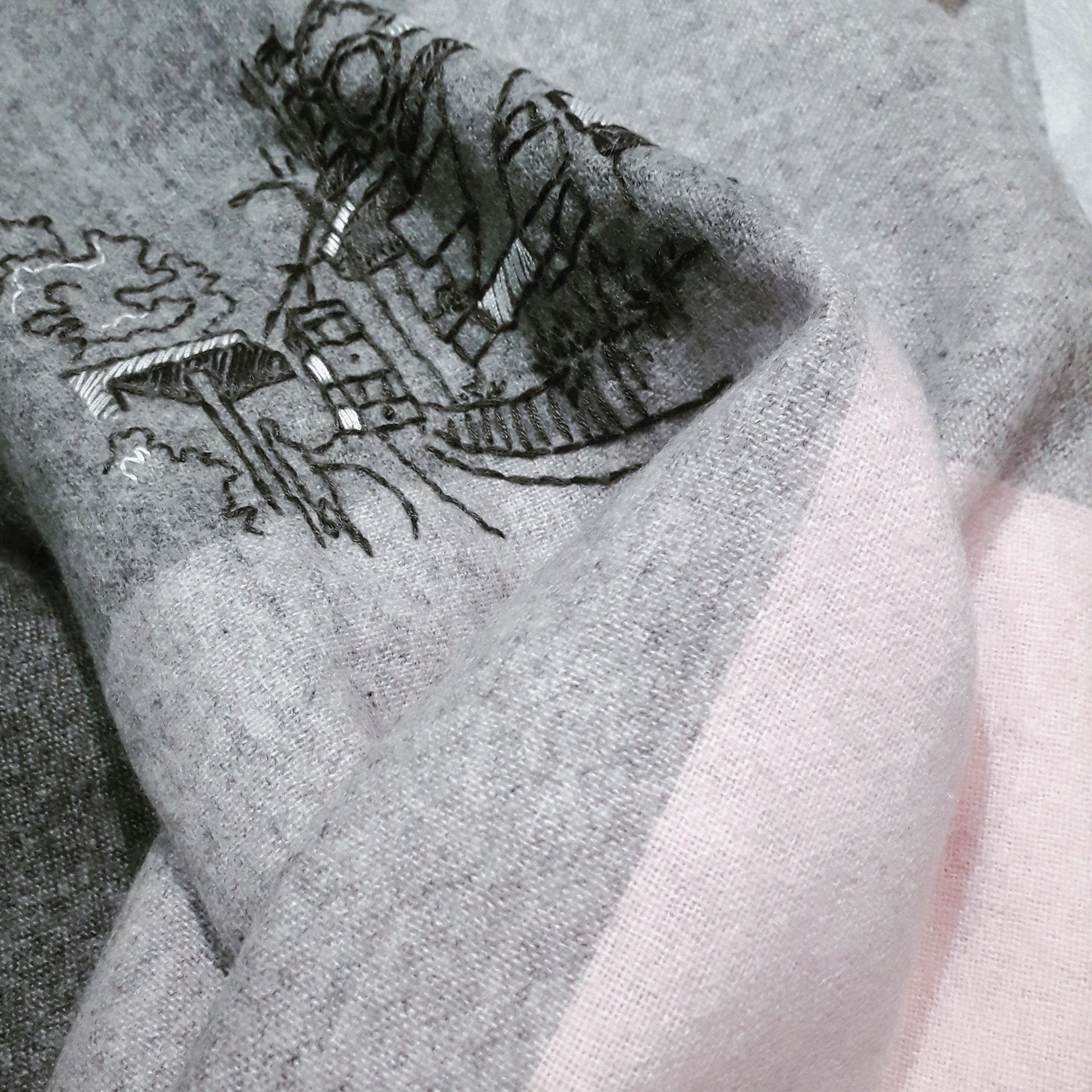 這款超柔軟光滑的純羊絨厚身圍巾,手工刺繡了電車在街上行駛的風景圖案。